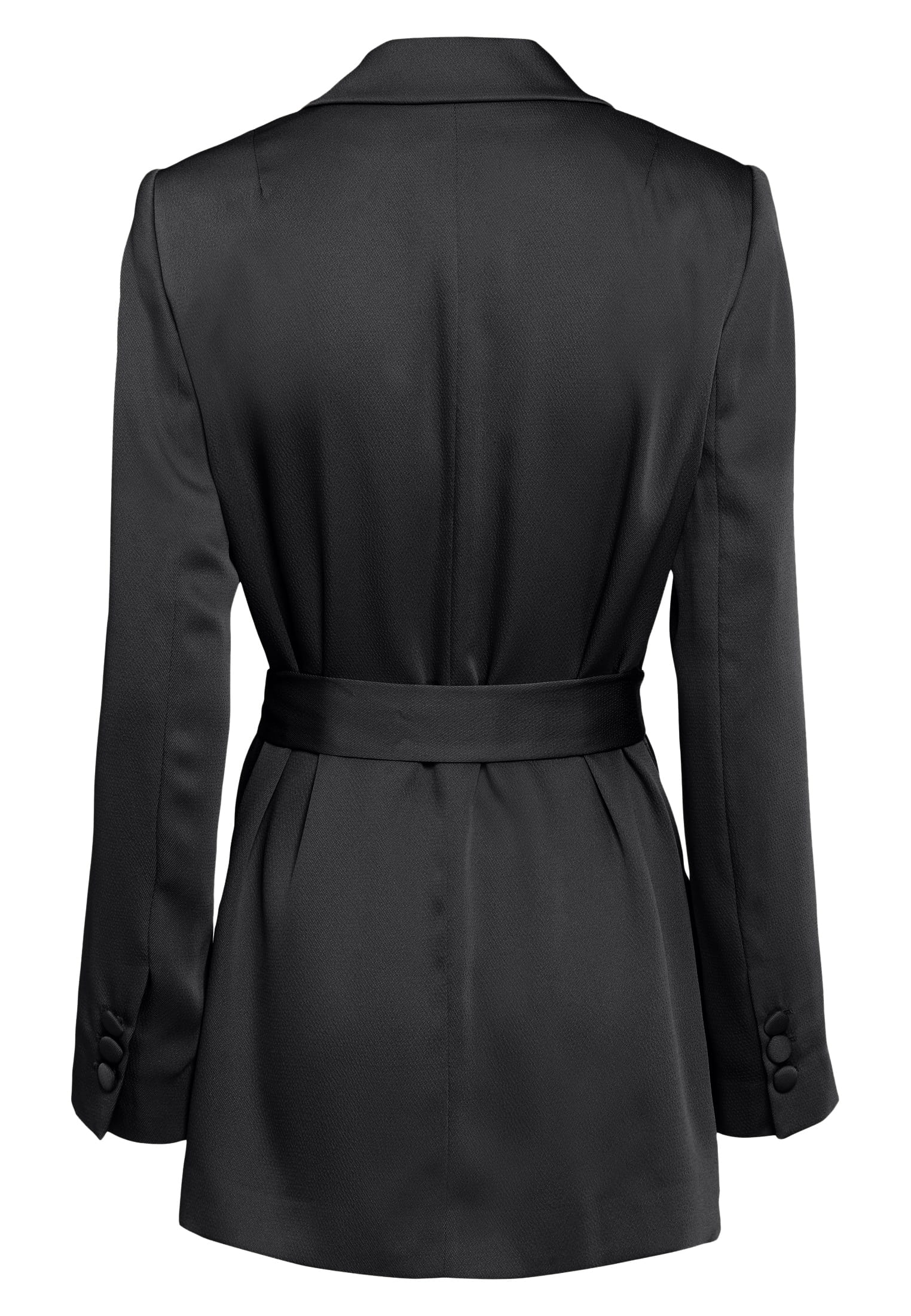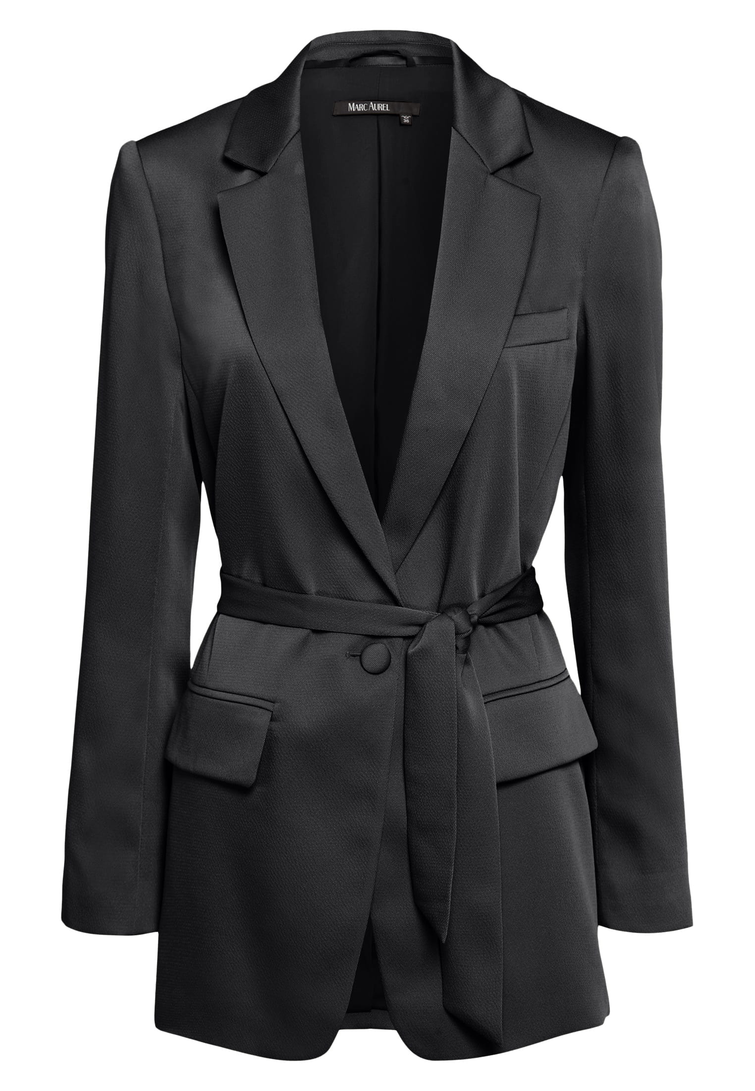 Dieser Blazer aus weich fallendem Struktur-Satin vereint zeitlose Eleganz mit fließender Leichtigkeit. Der Bindegürtel setzt eine feminine Akzentuierung der Taille, während Paspel- und Pattentaschen für stilvolle Details sorgen. Die Ärmel mit Schlitzverarbeitung und Seitenschlitze runden das Design perfekt ab.