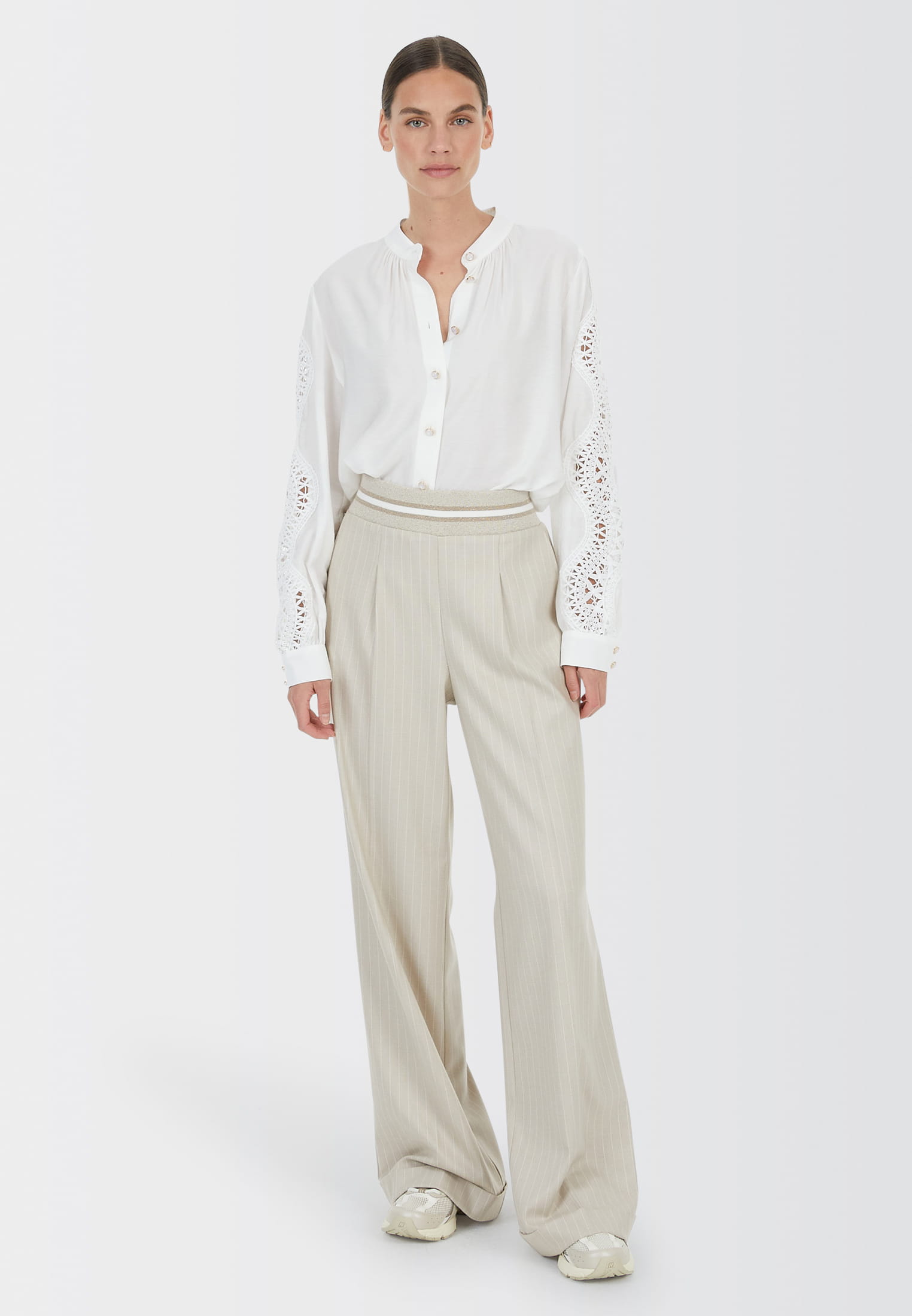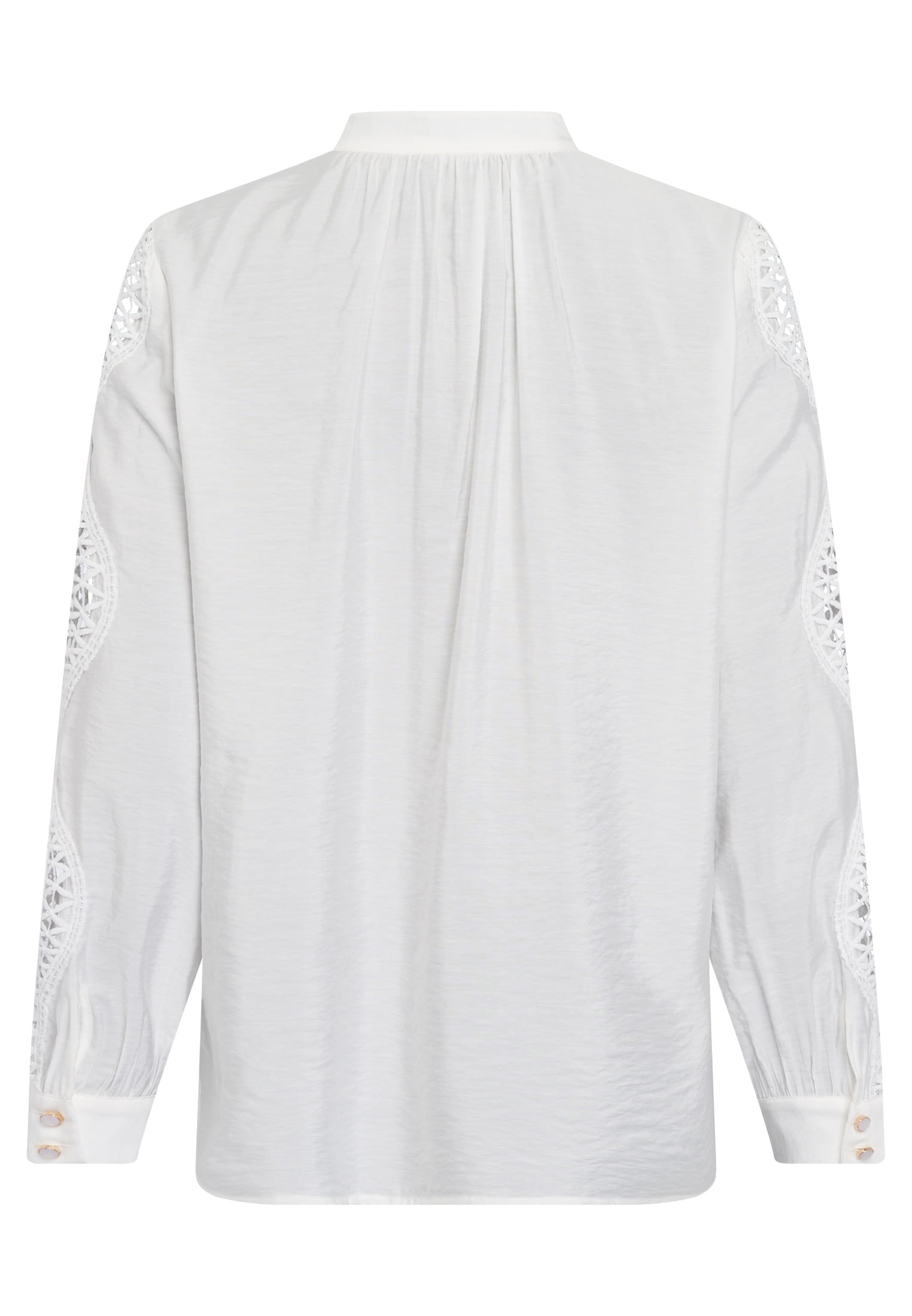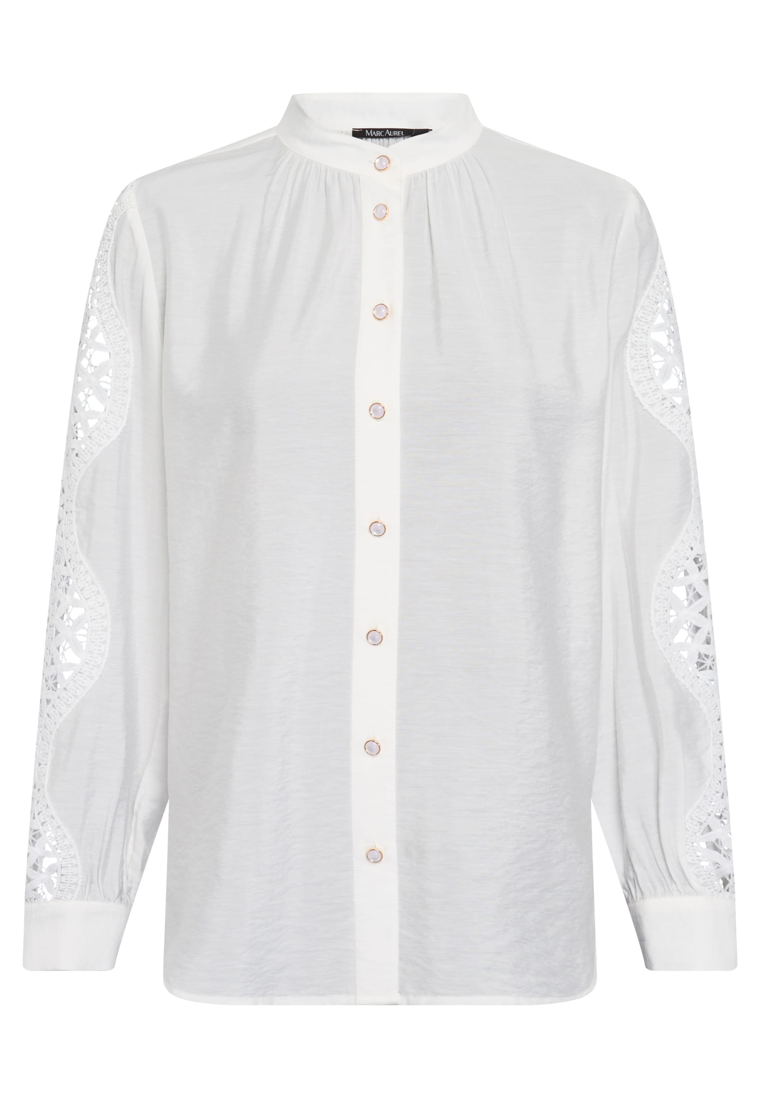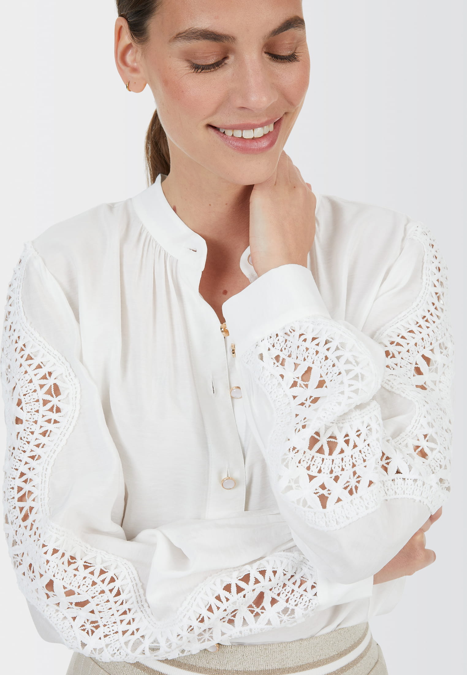Diese Bluse setzt mit ihrem eleganten Spitzenband-Einsatz an den Ärmeln ein raffiniertes Highlight. Der klassische Stehkragen sorgt für eine stilvolle Note, während Manschetten mit Schlitz und Kräusel-Details das Design abrunden. Ideal für einen modischen und zugleich edlen Auftritt.