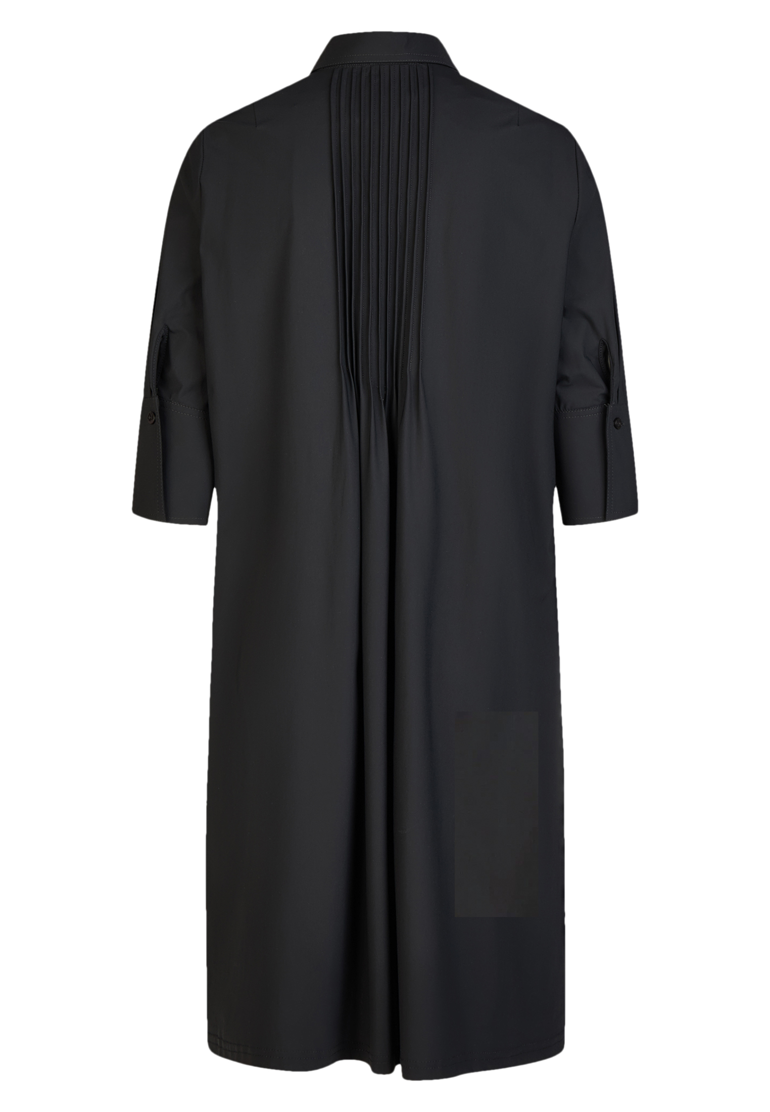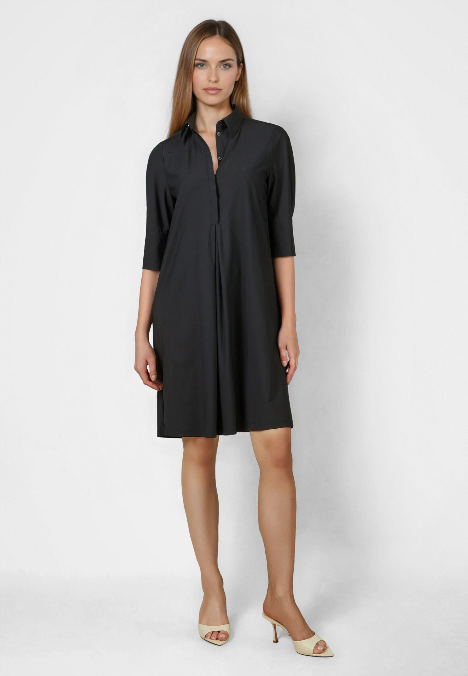 Der bi-elastische Jersey dieses Hemdblusenkleids bietet angenehmen Tragekomfort und Flexibilität, während der klassische Hemdkragen und die 3/4-Ärmel für eine klare, elegante Linie sorgen. Seitliche Nahttaschen verleihen dem Kleid zusätzlich Funktionalität.