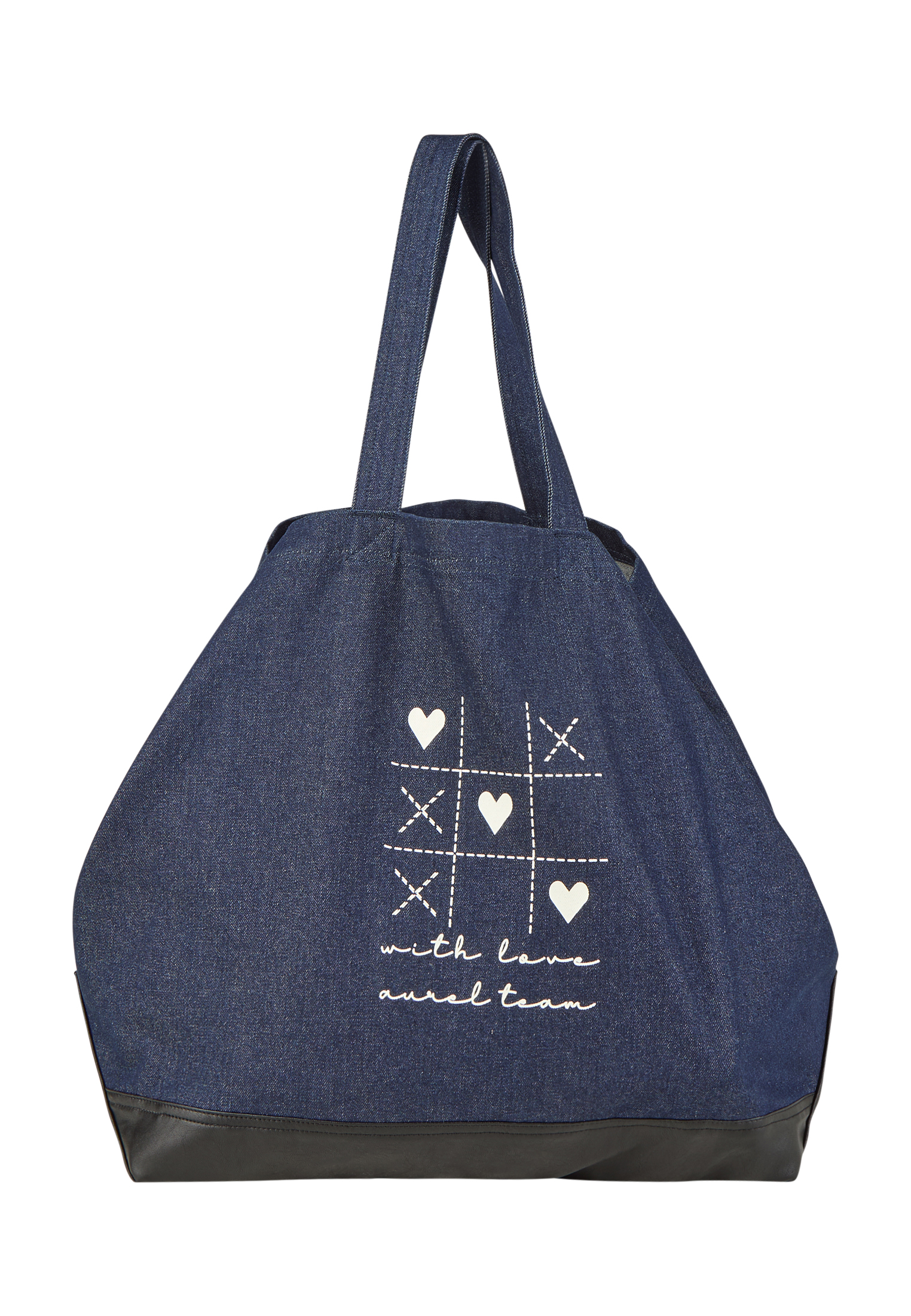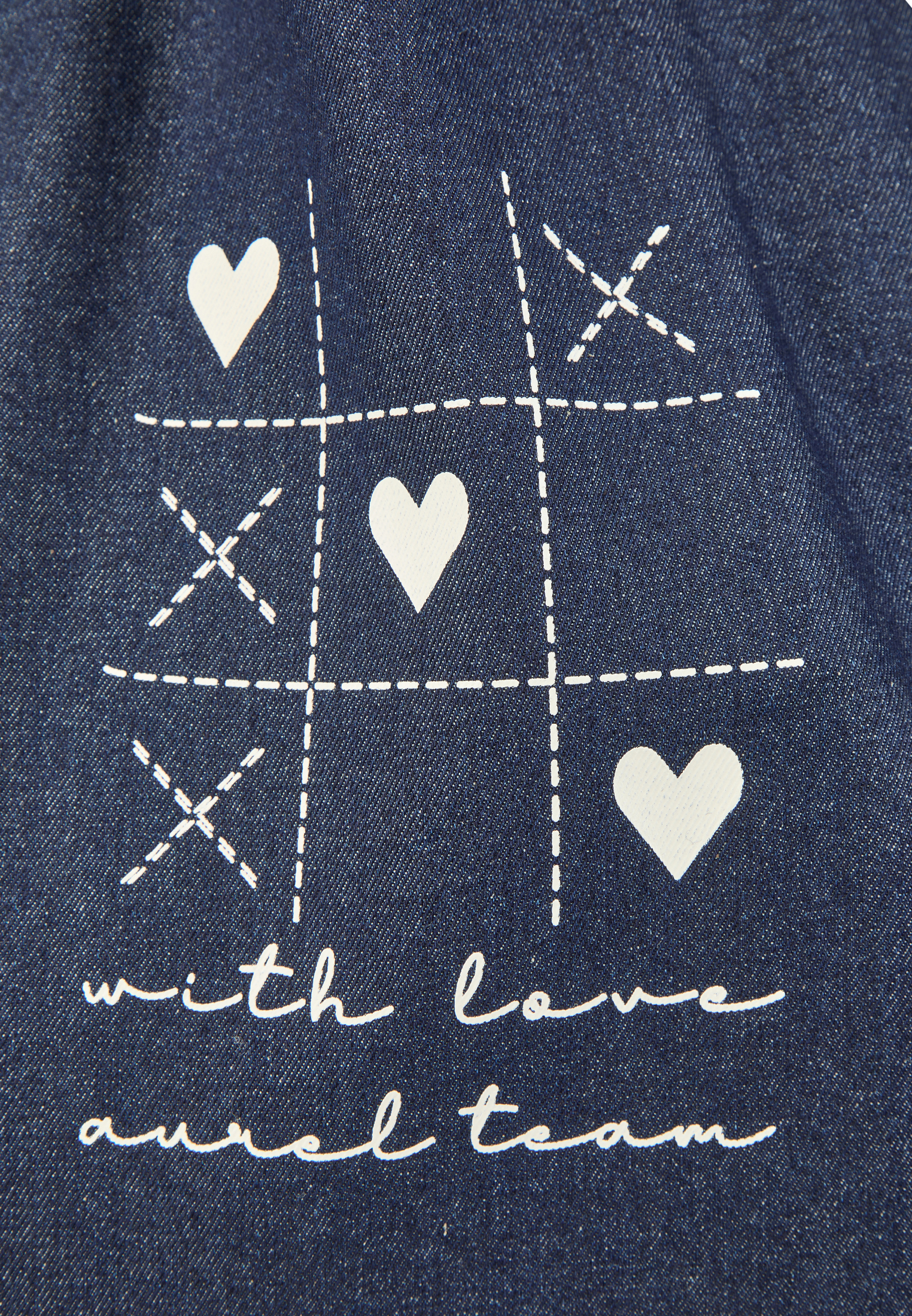 Robustes Blue Denim trifft auf veganes Leder und wird durch einen Glanzdruck mit Herzen veredelt. Eine Innentasche mit Reißverschluss bietet zusätzlichen Stauraum und Funktionalität.