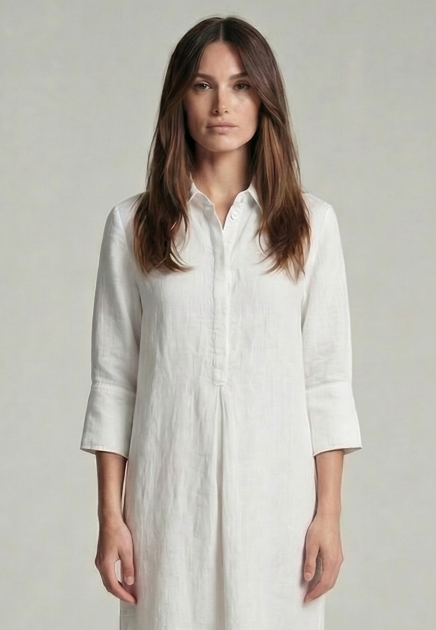 Dieses Kleid vereint sommerliches Leinen mit klassischen Hemd-Details. Ärmel mit Manschetten und eine verdeckte Knopfleiste bringen Struktur, während Nahttaschen für praktische Leichtigkeit und Alltagstauglichkeit sorgen. Perfekt für einen lässigen und dennoch trendigen Look.