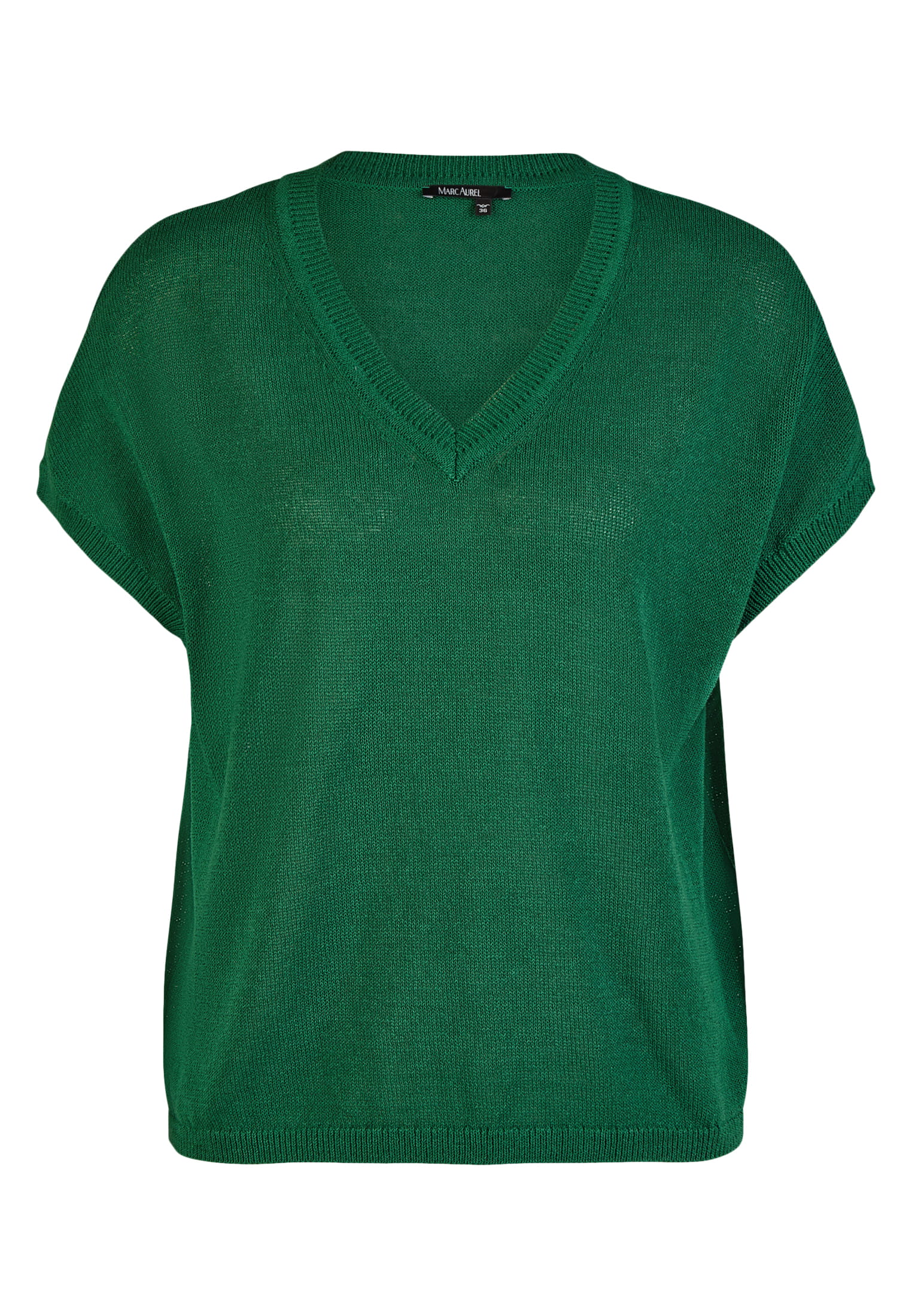 Der Baumwoll-Mix in Leinen-Optik vereint einen V-Ausschnitt und feine Rippenkanten mit einem modernen, legeren Oversized-Schnitt. Perfekt für einen lässigen und dennoch trendigen Look.
