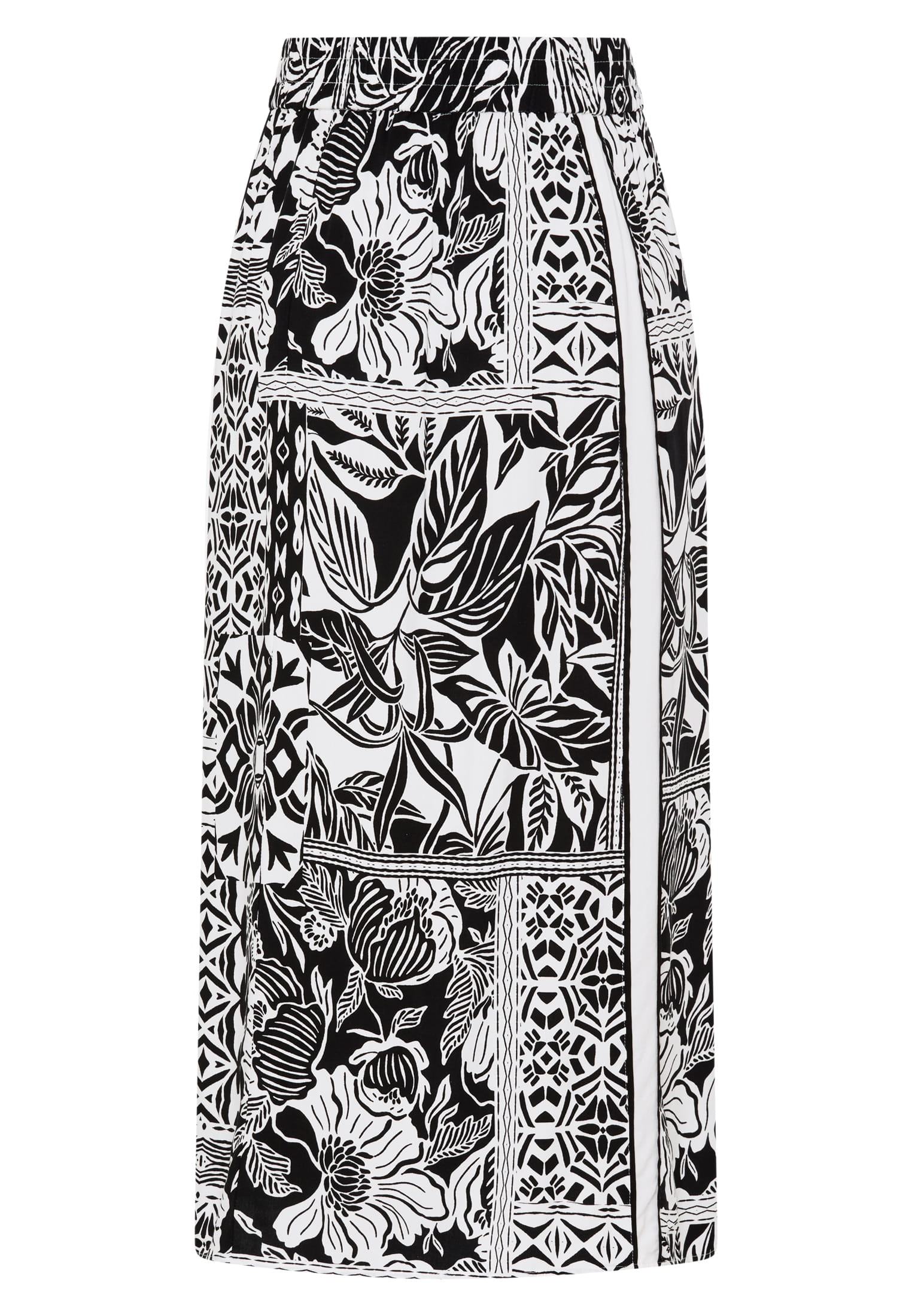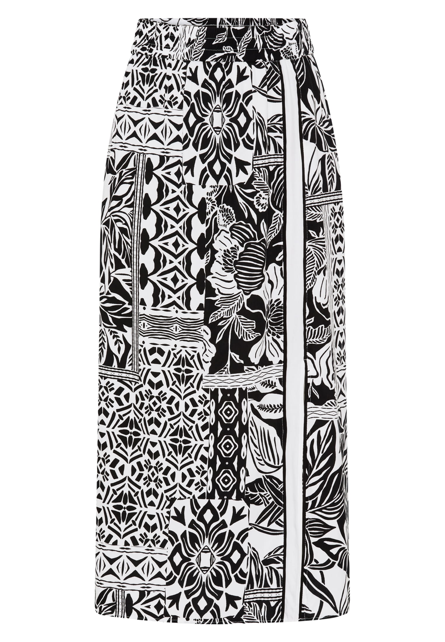 Dieser Rock setzt auf kreative Muster und einen entspannten Schnitt. Das weich fallende Viskosematerial kombiniert ein elastisches Joggerbündchen mit einem seitlichen Schlitz für Bewegungsfreiheit. Ein Printrock für sommerliche Styles mit individueller Note.