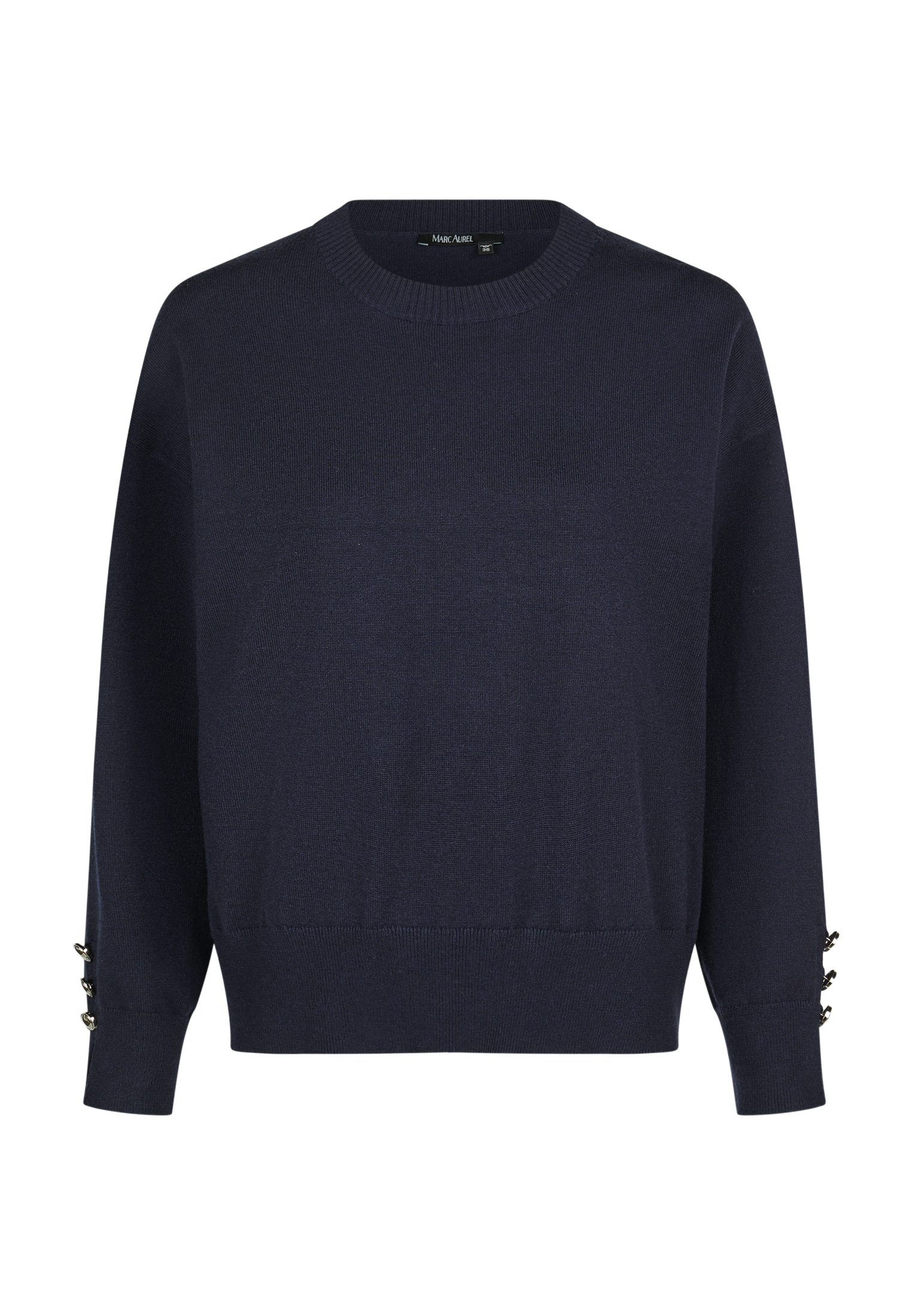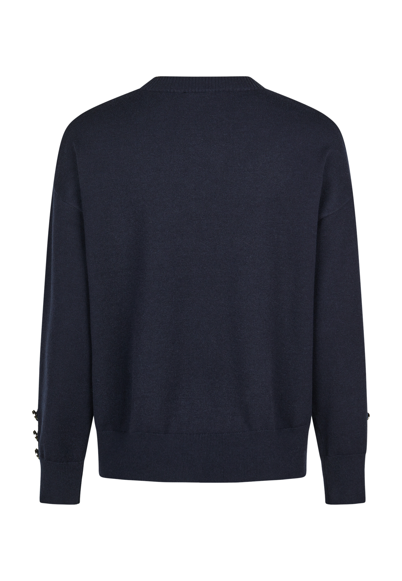 Dieser Rundhalspullover setzt mit feinen Schmuckknöpfen dezente Akzente. Der weiche Viskose-Mix bietet angenehmen Tragekomfort, während das verlängerte Rückenteil und die Manschetten mit Schlitz das Design harmonisch vollenden.