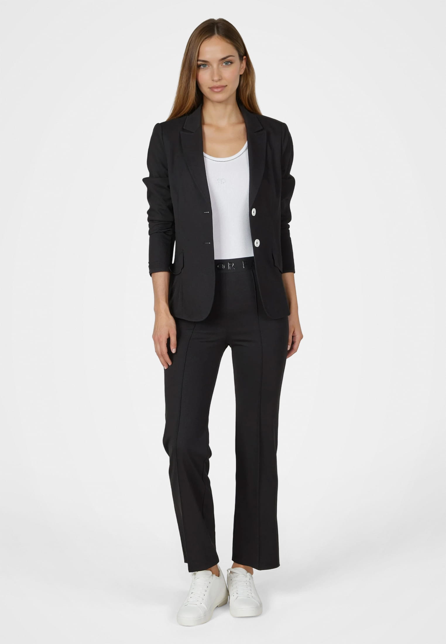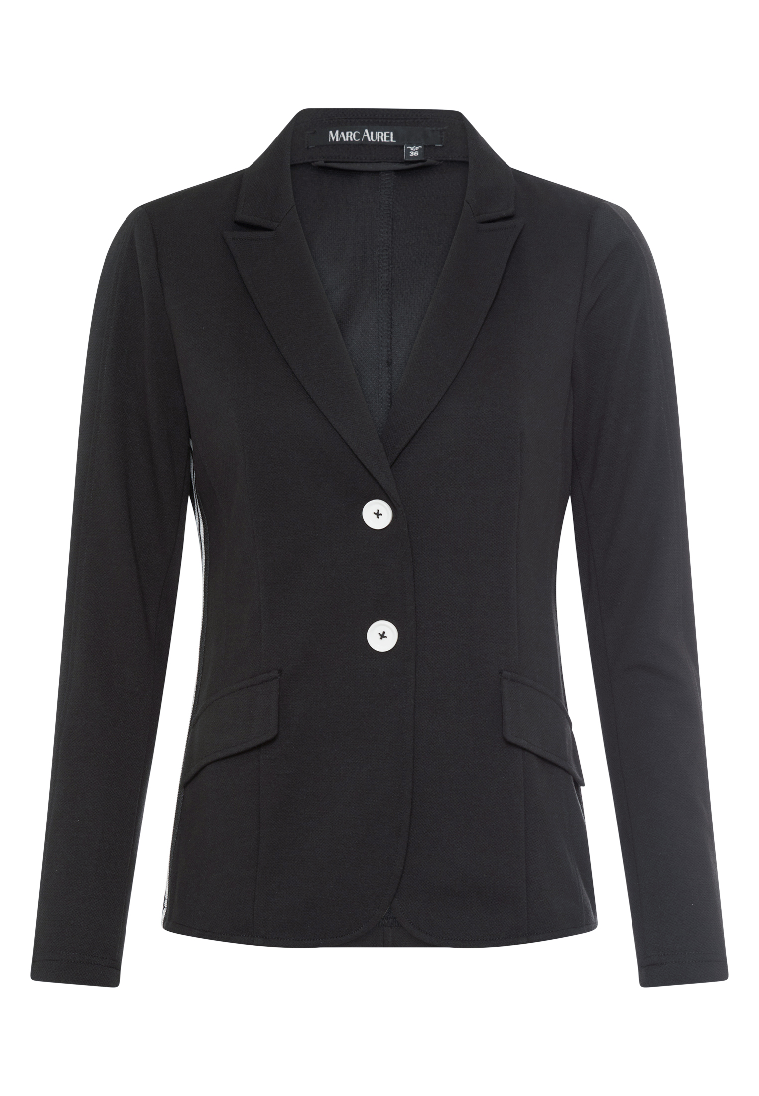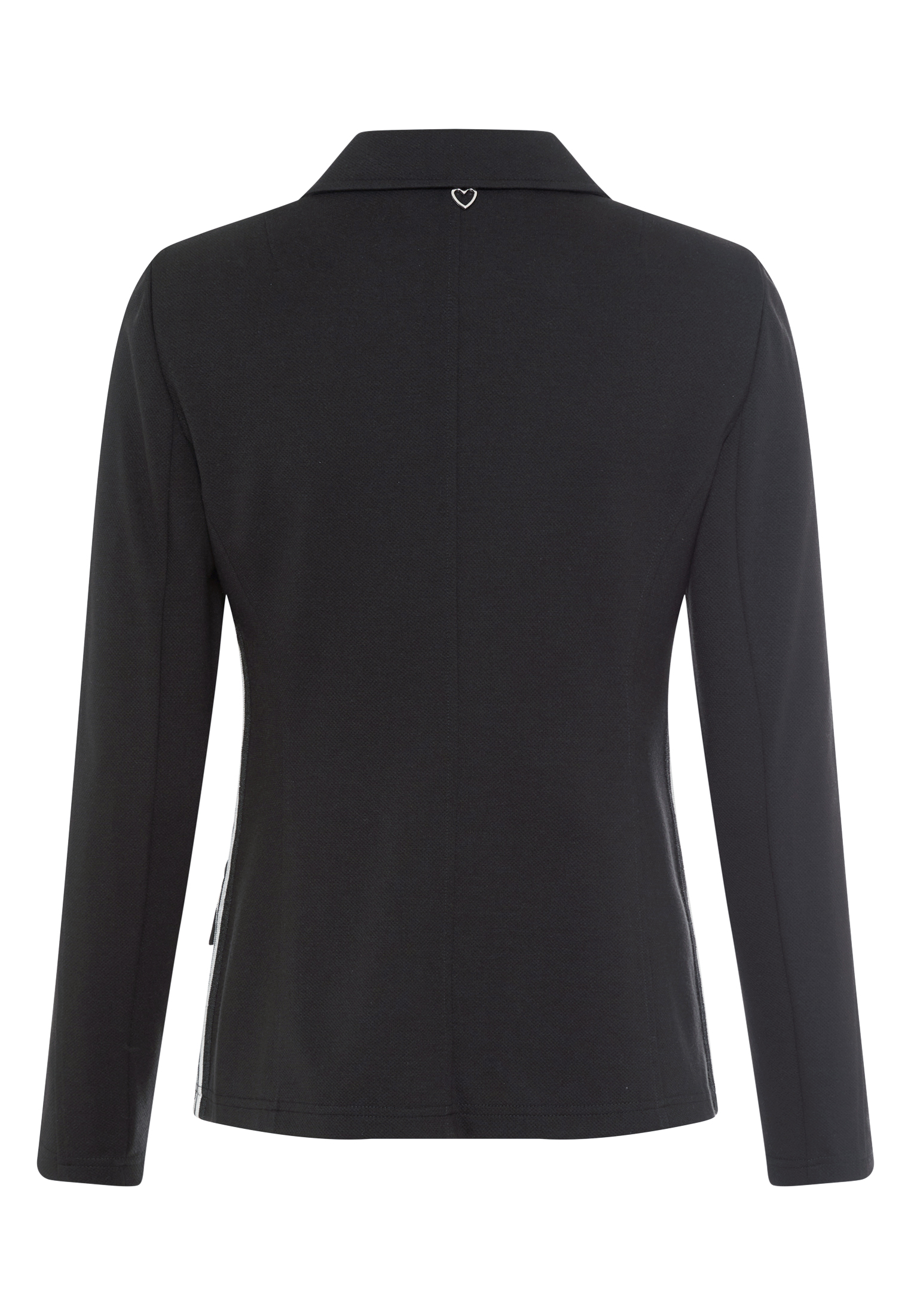 Dieser Blazer aus weichem Piqué-Jersey überzeugt durch dekorative Teilungsnähte, aufgesetzte Klappen und seitliche Streifenbänder, die moderne Akzente setzen. Das fallende Revers unterstreicht die sportive Eleganz und verleiht dem Design eine zeitgemäße Note.