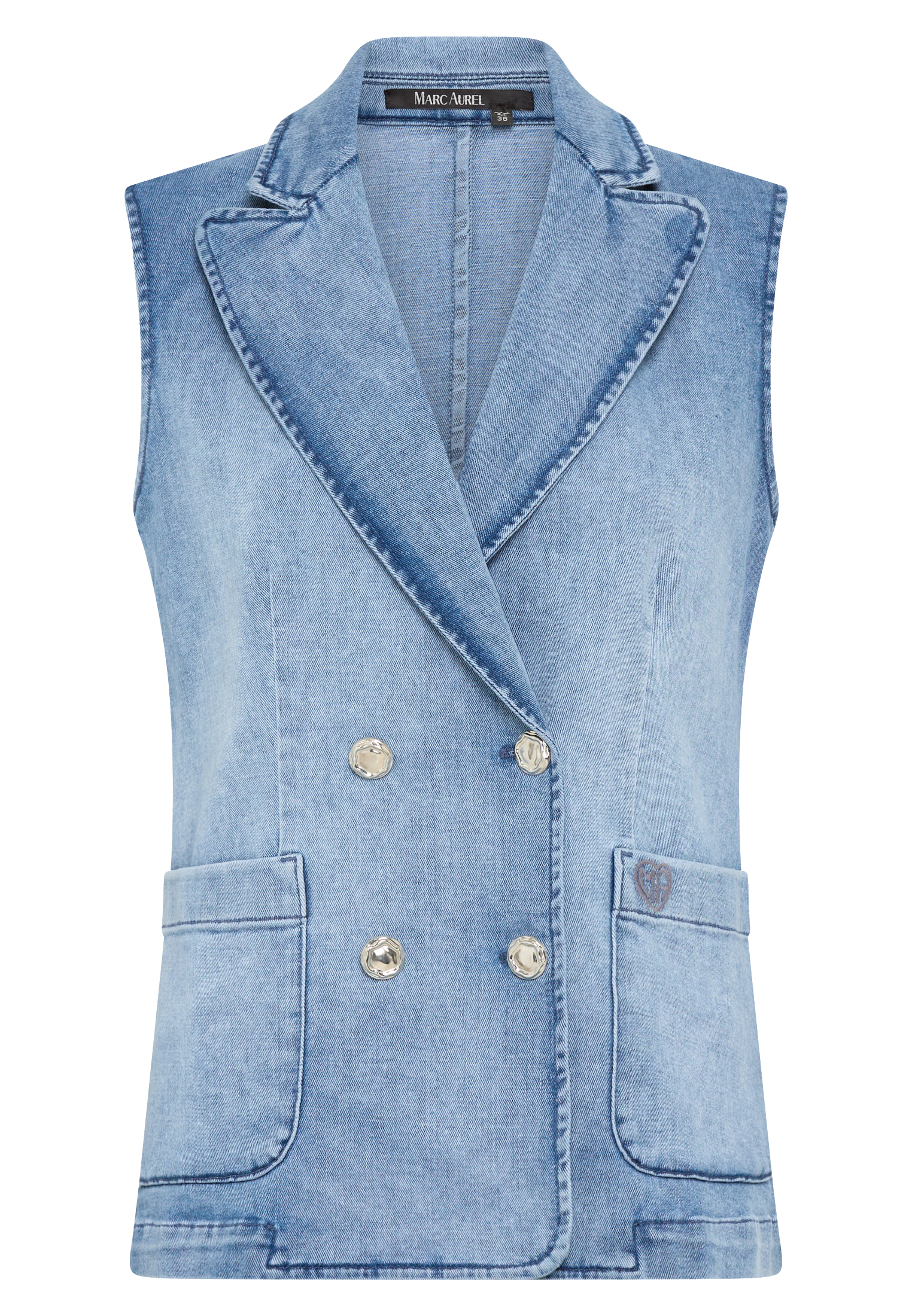 Diese Weste bringt klassische Denim-Elemente in eine moderne Form. Die doppelte Knopfreihe, aufgesetzte Taschen und die Logostickerei unterstreichen den authentischen Look, während die Schlitzoptik das Design auflockert. Die formstabile Denimqualität mit sommerlicher Waschung sorgt für angenehmen Sitz.