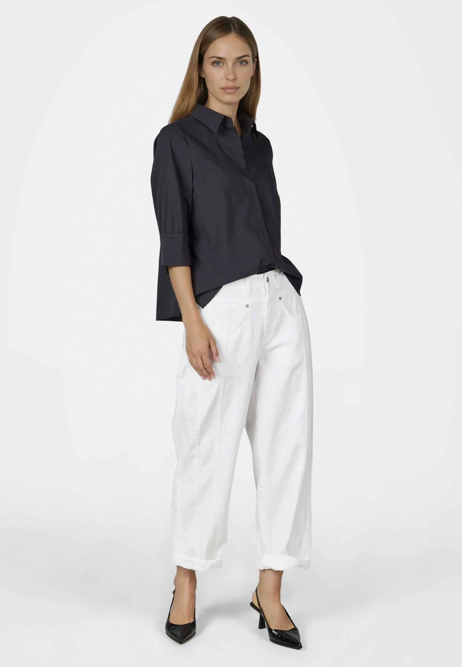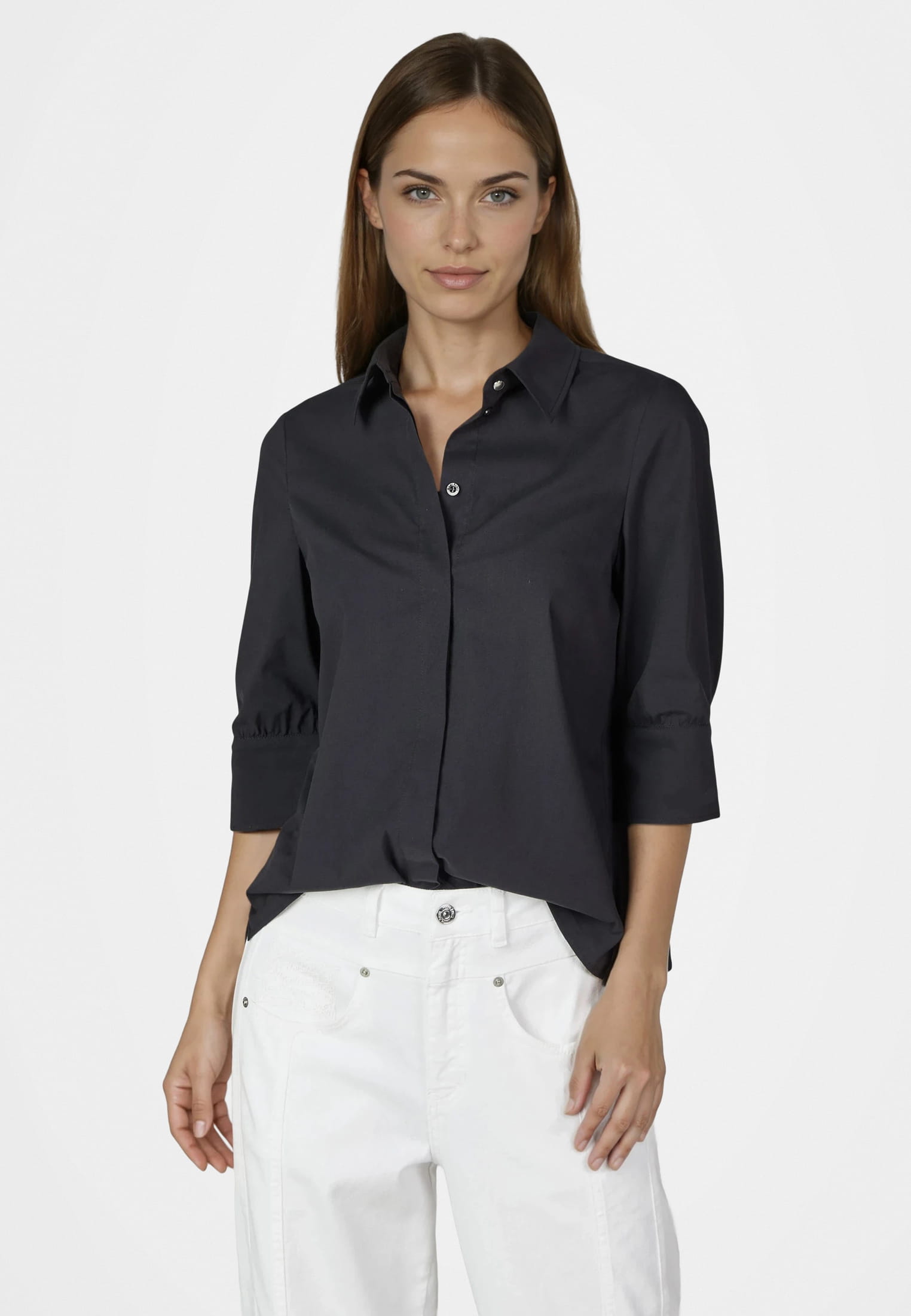 Ein Hemd mit besonderem Detailreichtum. Die leichte Baumwollmischung mit Stretch trägt sich angenehm, während 3/4-Ärmel, Rückenfalten und ein klassischer Hemdkragen die Optik definieren. Ein kleiner Schlitz in der Seitennaht ergänzt den modernen Schnitt mit subtiler Raffinesse.