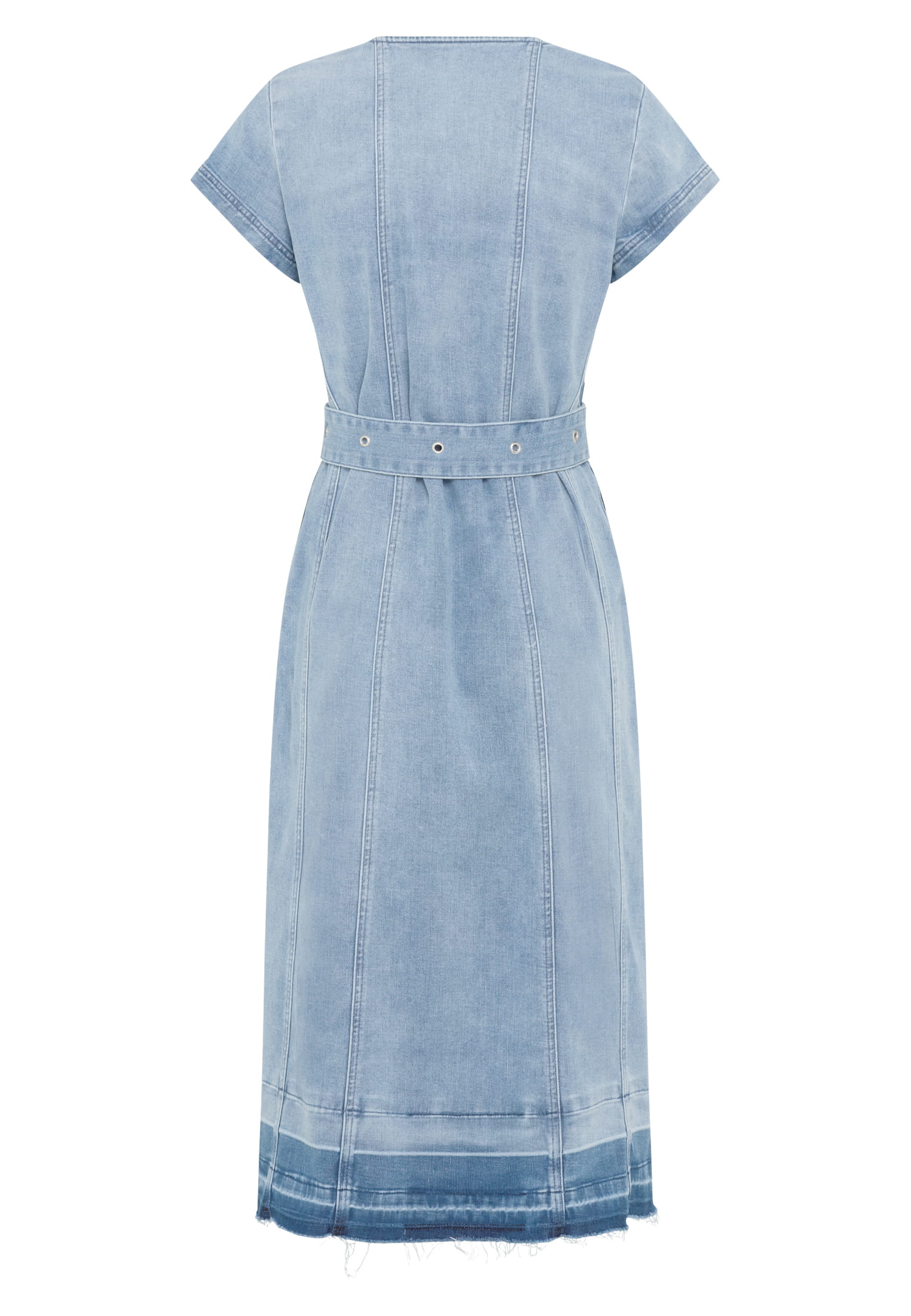 Ein Kleid mit markantem Denim-Charakter, gefertigt aus strukturierter Baumwolle mit Blue-Waschung. Der V-Ausschnitt, ein passender Gürtel und Pattentaschen schaffen eine klare Form, während Nahttaschen den Look dezent abrunden. Perfekt für einen stilvollen und modernen Look.