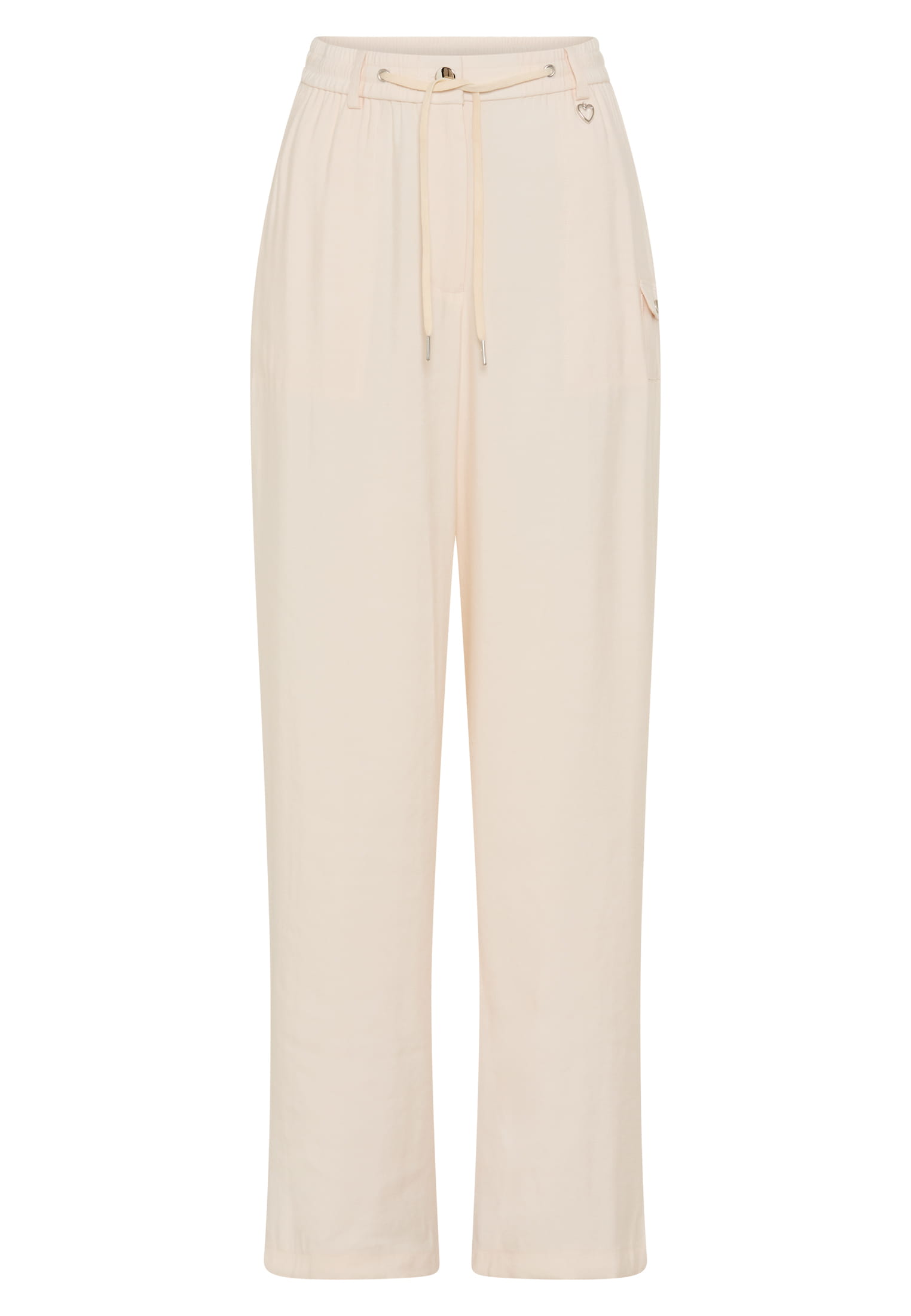 Diese Hose aus leicht glänzendem Twill bringt sportive Elemente in eine fließende Form. Ein elastisches Joggerbündchen trifft auf aufgesetzte Cargotaschen, ergänzt durch ein kleines Metallherz als Akzent. Für moderne Looks mit entspannter Silhouette.