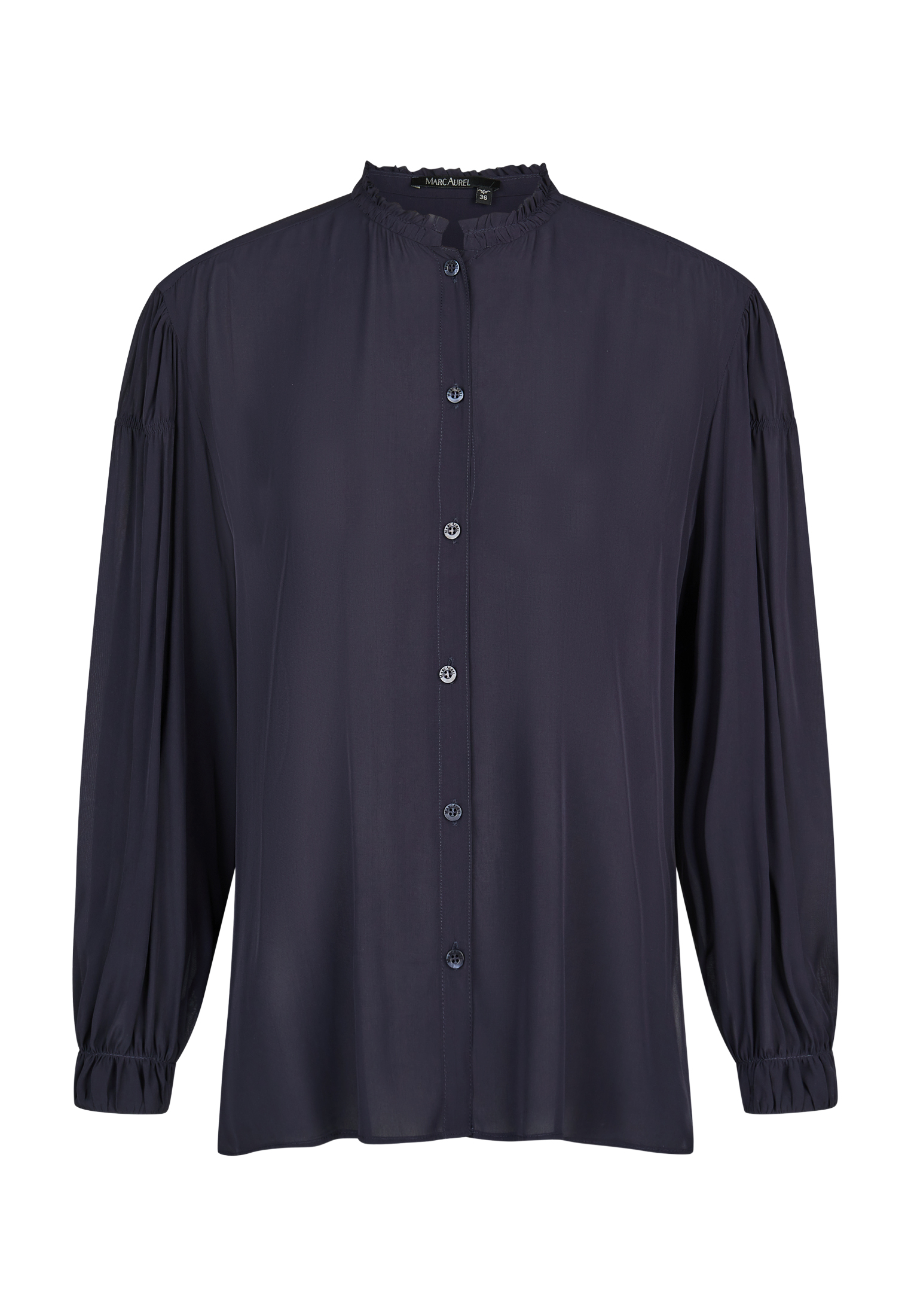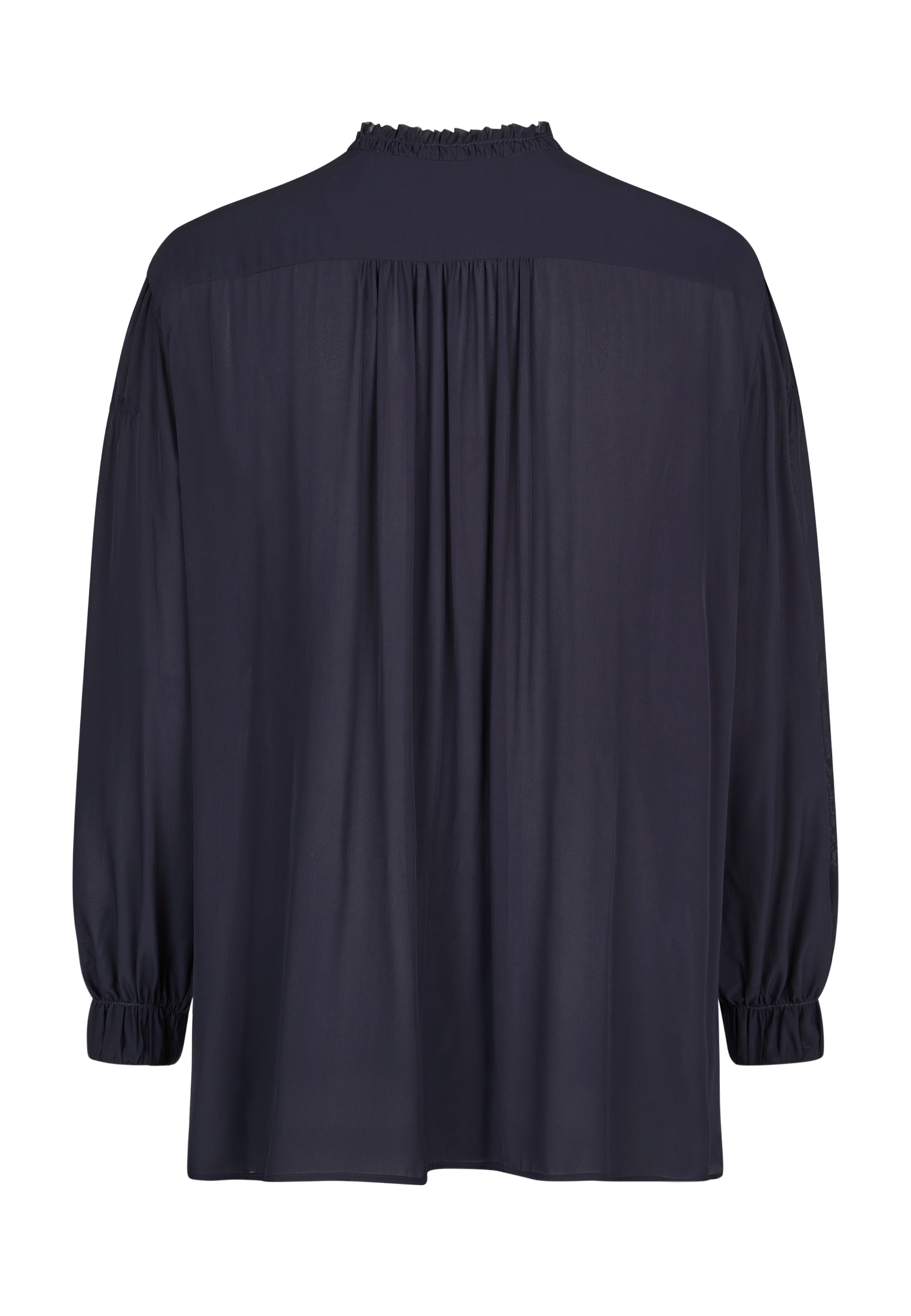 This blouse made from flowing viscose chiffon skillfully plays with volume and transparency. The stand-up collar adds elegance, while the sleeves with pleats and elastic create a loose, modern silhouette. The oversized cut rounds off the relaxed look.