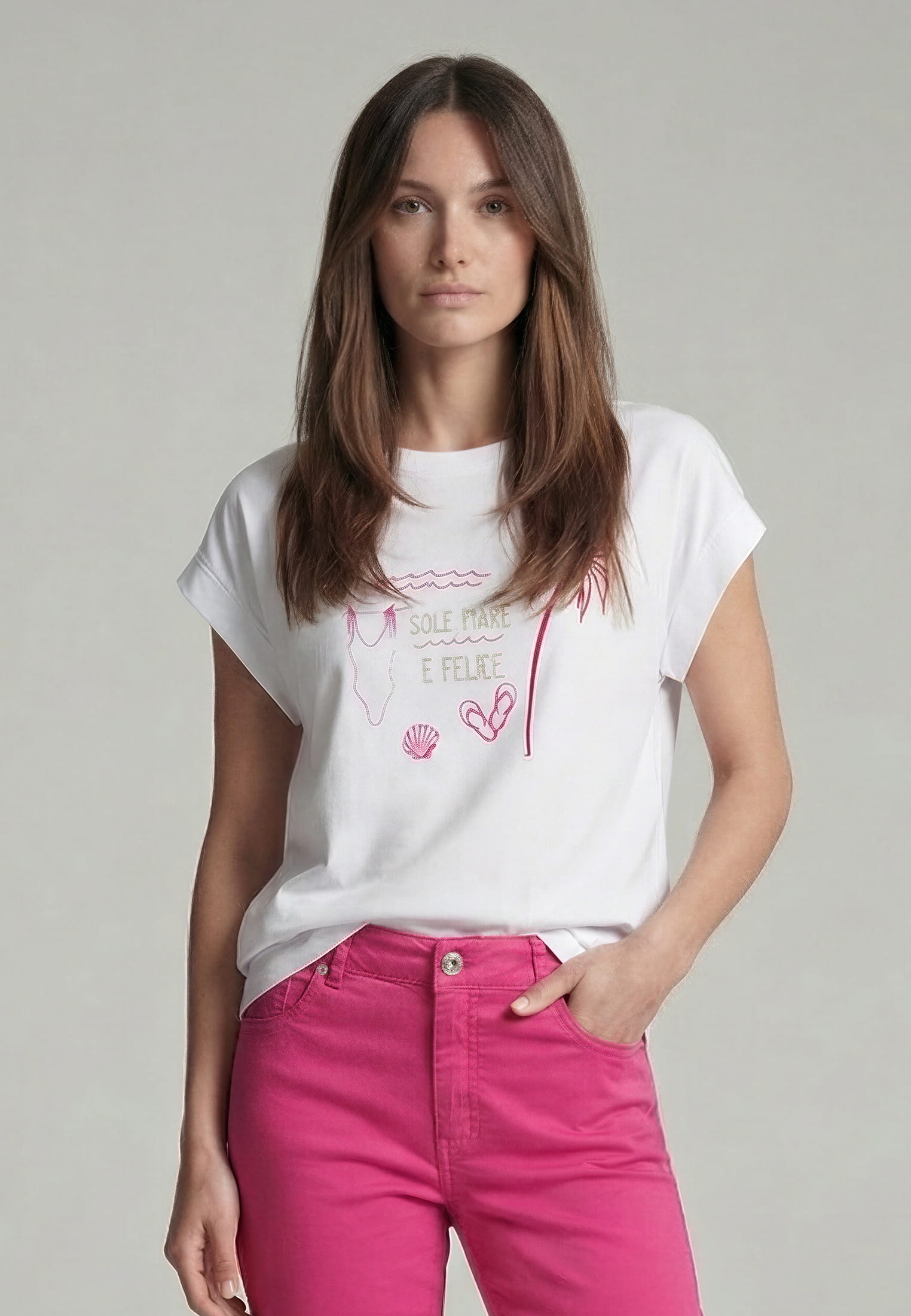 This crew neck shirt adds a creative touch to any outfit with its front print. A small metal logo on the hem subtly complements the design. For anyone who wants to liven up their outfit with a graphic detail. Perfect for a casual yet trendy look.
