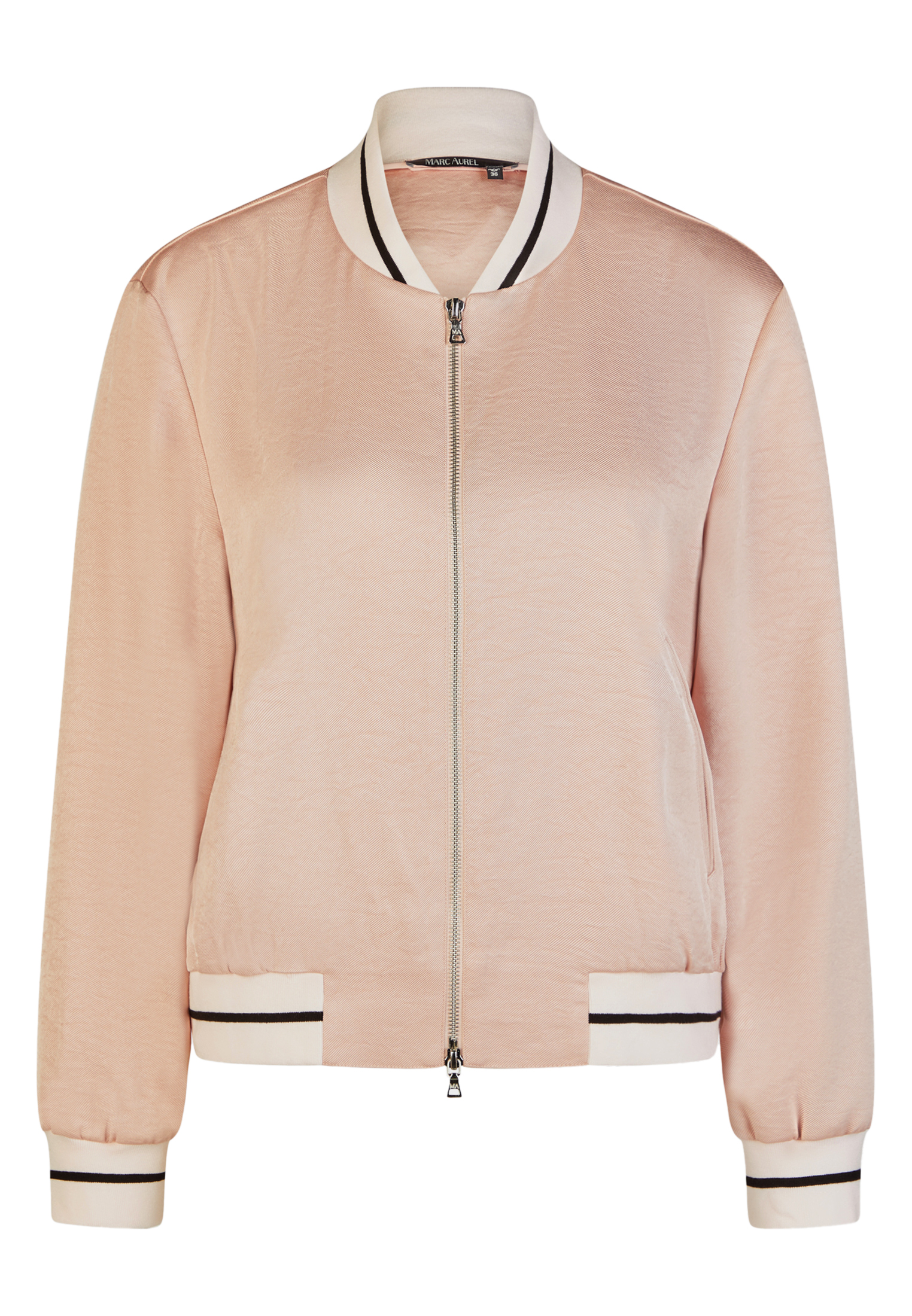 This blouson combines softly draping twill with a subtle sheen and sporty knit elements with contrasting stripes. Piped pockets create clean lines, while the bomber jacket collar emphasizes the sporty character. Ideal for a fashionable yet elegant look.