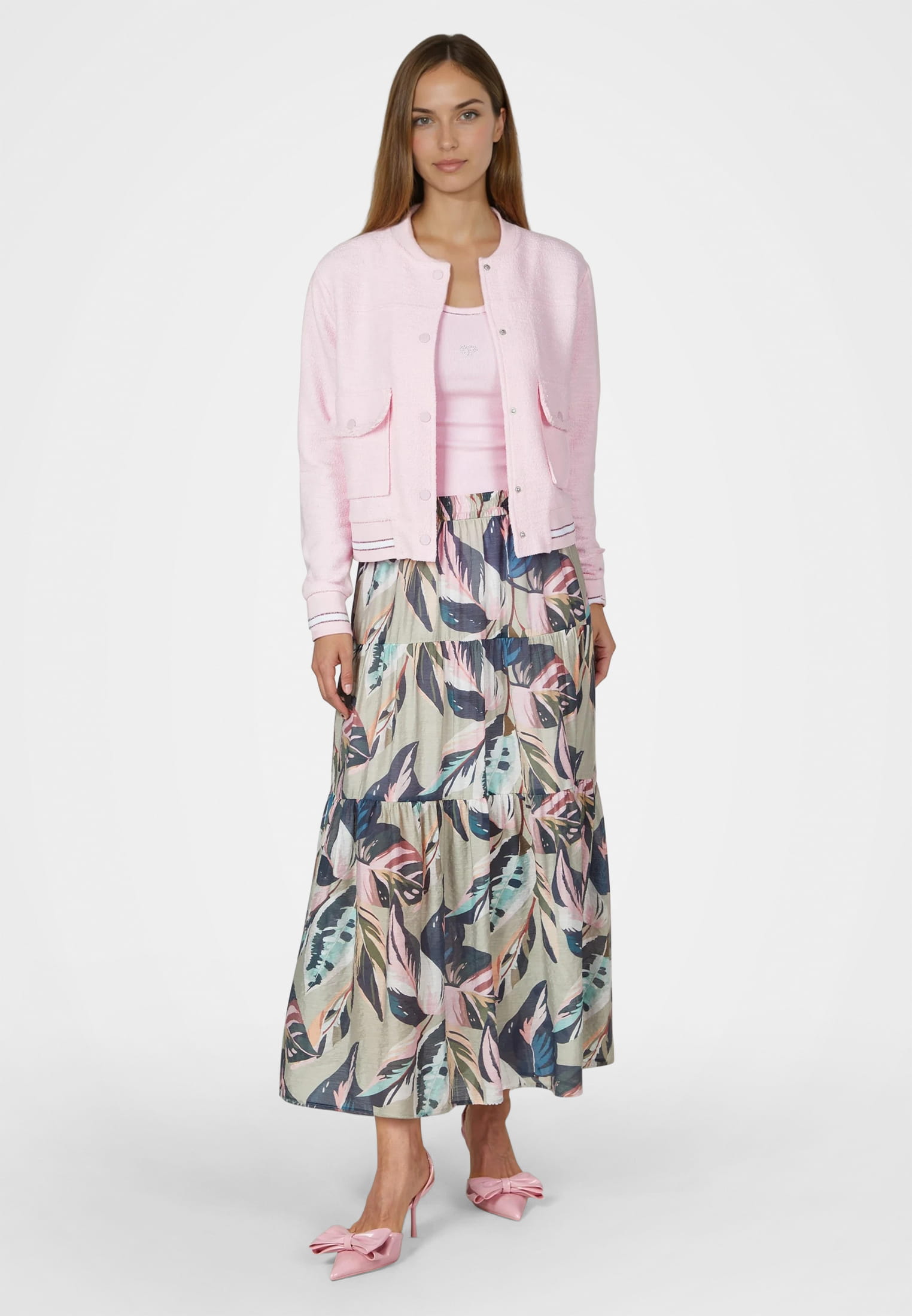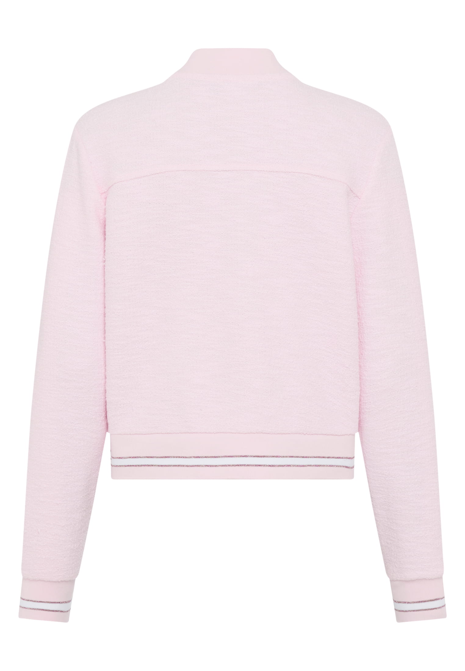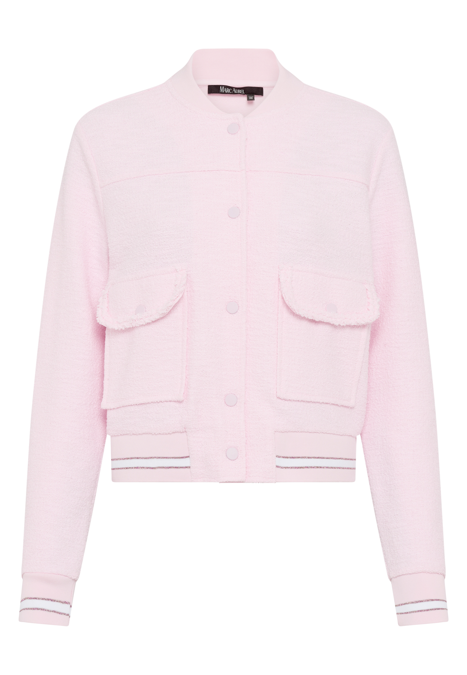 This jacket brings a sporty character to the table with its stand-up collar and patch pockets. The ribbed cuffs ensure a comfortable fit, while the loose bomber shape emphasizes the design. Ideal for a fashionable yet elegant look.