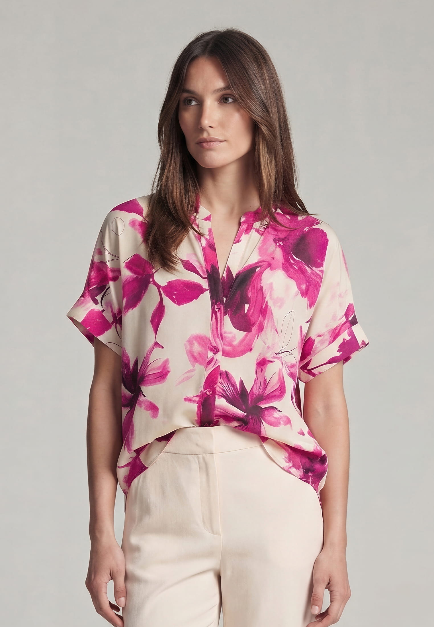 A blouse that combines floral lightness with a comfortable cotton blend. The V-neckline transitions into a button placket, while dropped shoulders and pleated cuffs give the design a soft shape. Perfect for a casual yet trendy look.