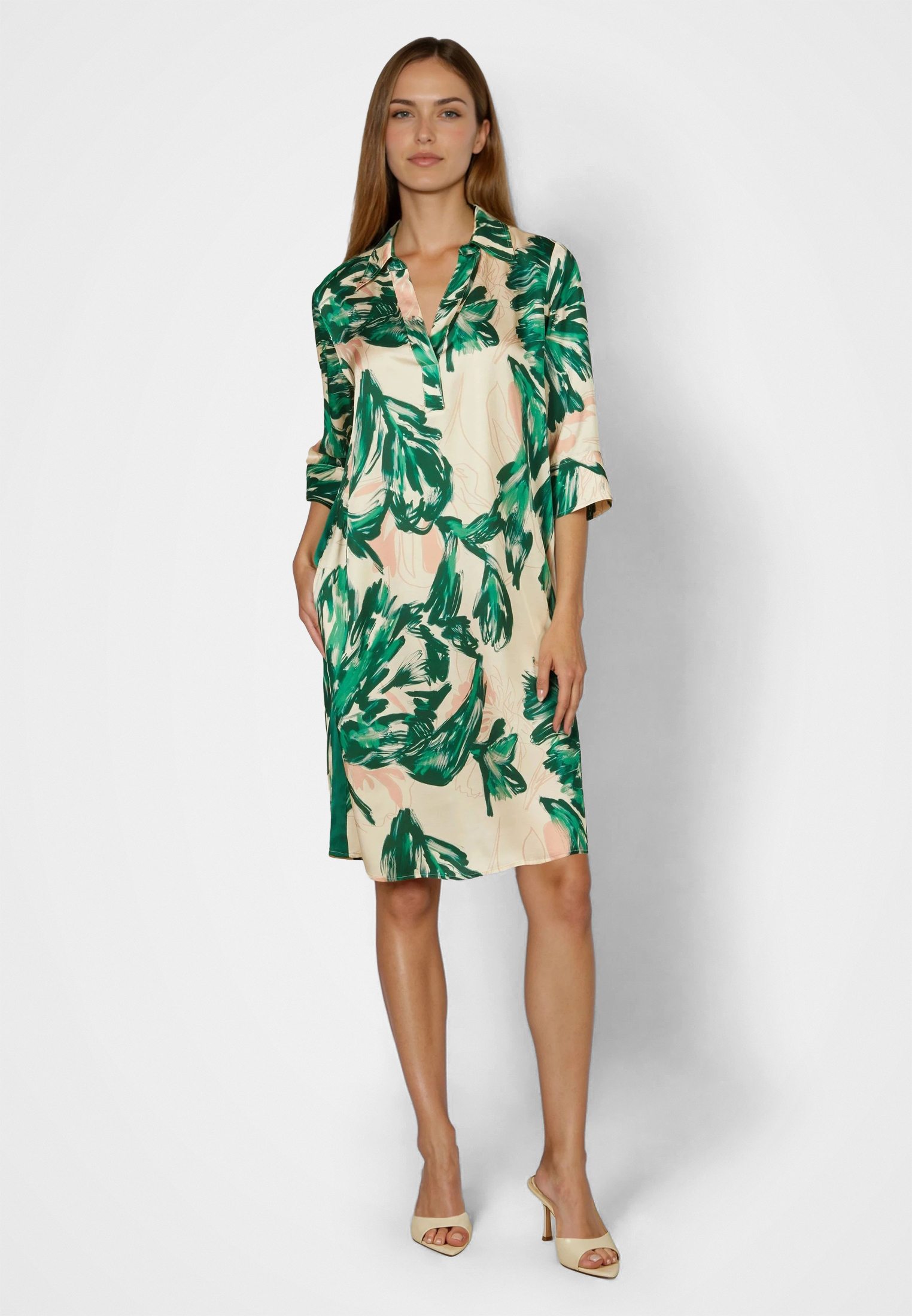 This dress made from lightweight viscose satin combines a vibrant print with sporty details. The polo collar gives the look a clear contour, while slit cuffs round off the design. The flowing fabric ensures a comfortable fit. Perfect for a casual yet trendy look.