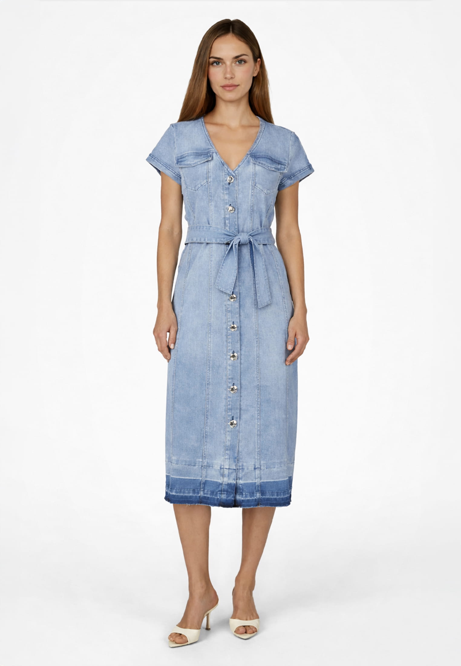 Ein Kleid mit markantem Denim-Charakter, gefertigt aus strukturierter Baumwolle mit Blue-Waschung. Der V-Ausschnitt, ein passender Gürtel und Pattentaschen schaffen eine klare Form, während Nahttaschen den Look dezent abrunden. Perfekt für einen stilvollen und modernen Look.