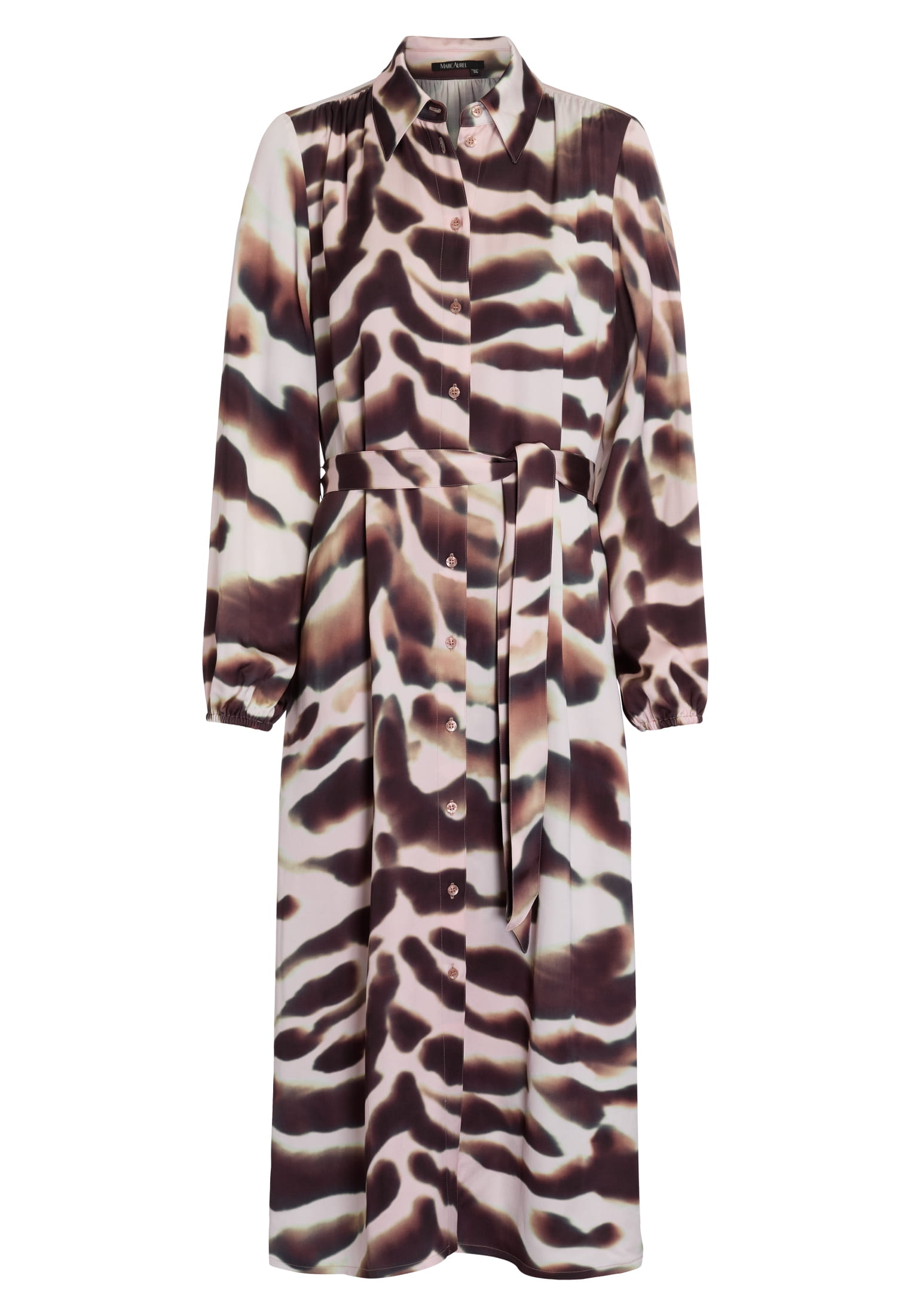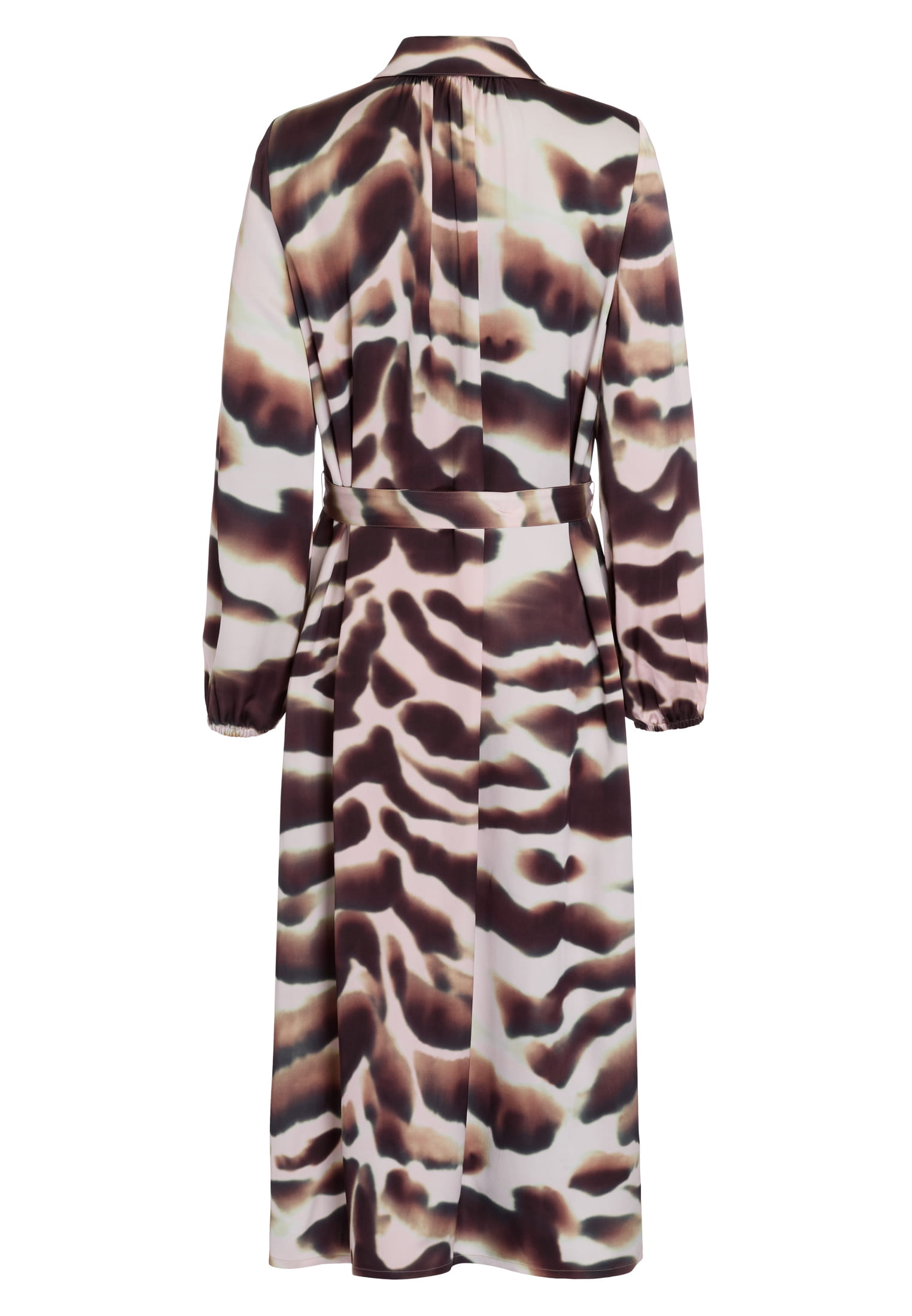 Dieses Kleid aus fließendem Viskose-Satin setzt mit seinem abstrakten Animalprint ein modisches Statement. Der Hemdkragen verleiht dem Design eine klassische Note, während der abnehmbare Gürtel für eine flexible Passform sorgt. Ideal für einen modischen und zugleich edlen Auftritt.