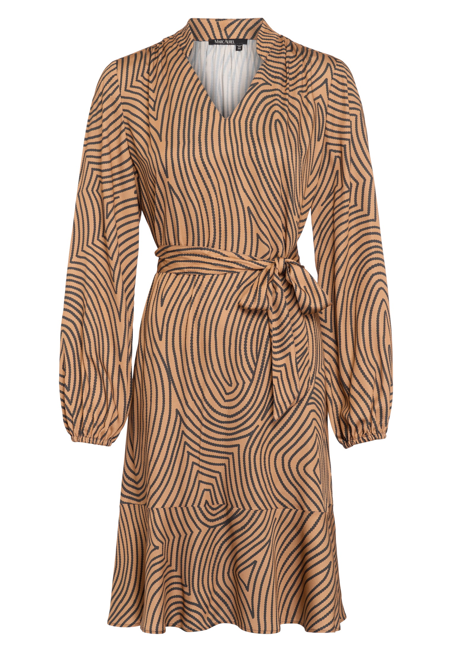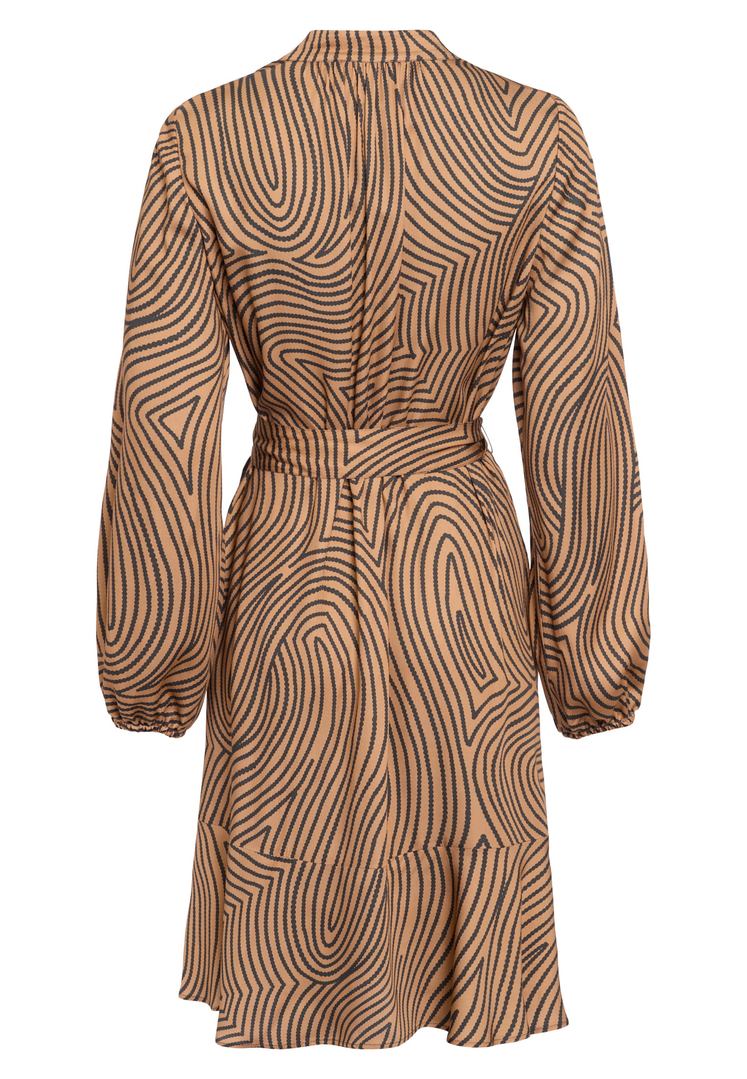 Dieses kurze Kleid aus fließender Viskose begeistert mit einem modernen grafischen Print und femininen Details. Der V-Ausschnitt sorgt für eine elegante Note, während das Bindeband am Stehkragen für verschiedene Tragemöglichkeiten sorgt. Ideal für einen modischen und zugleich edlen Auftritt.