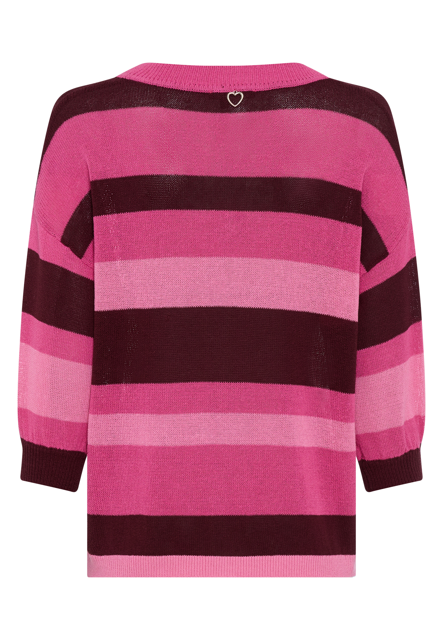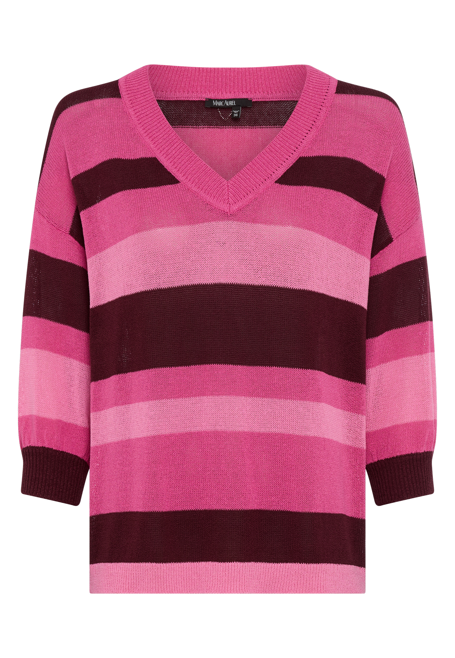 Ein Pullover mit Farbakzent. Die kontrastierenden Ringel in Pink und Chianti setzen lebendige Akzente, während der V-Ausschnitt und die bauschigen Ärmel dem Design eine weiche Silhouette verleihen. Überschnittene Schultern runden den Look mit Lässigkeit ab.