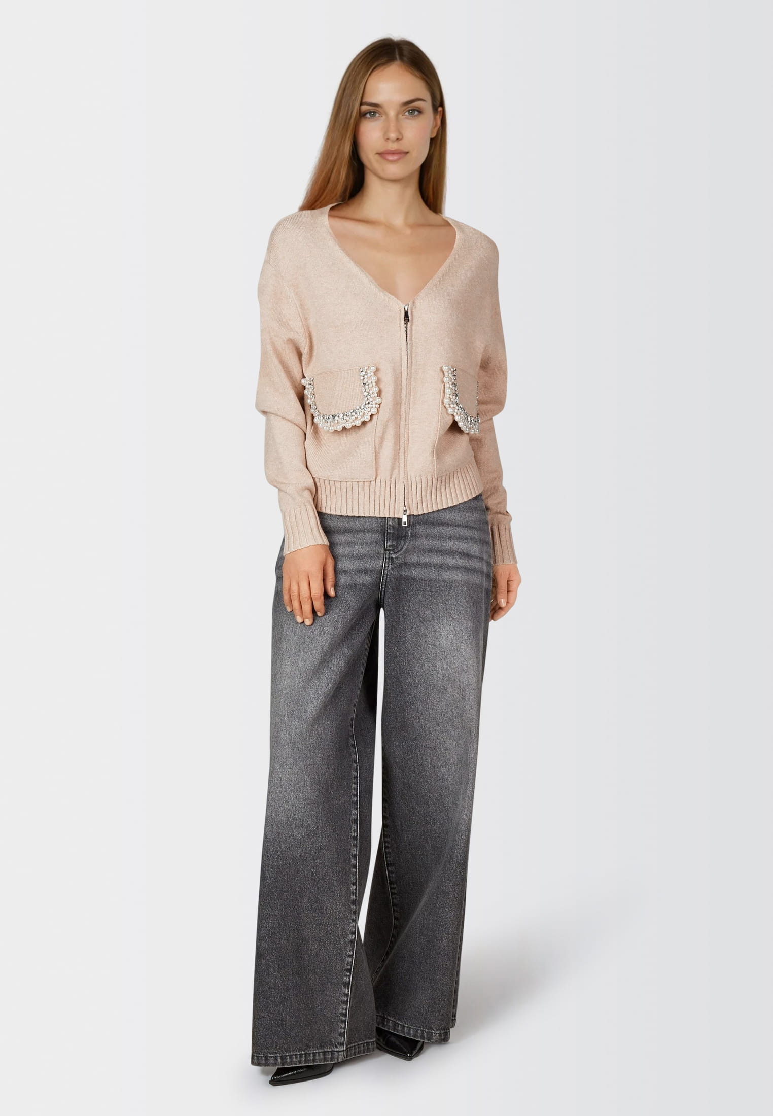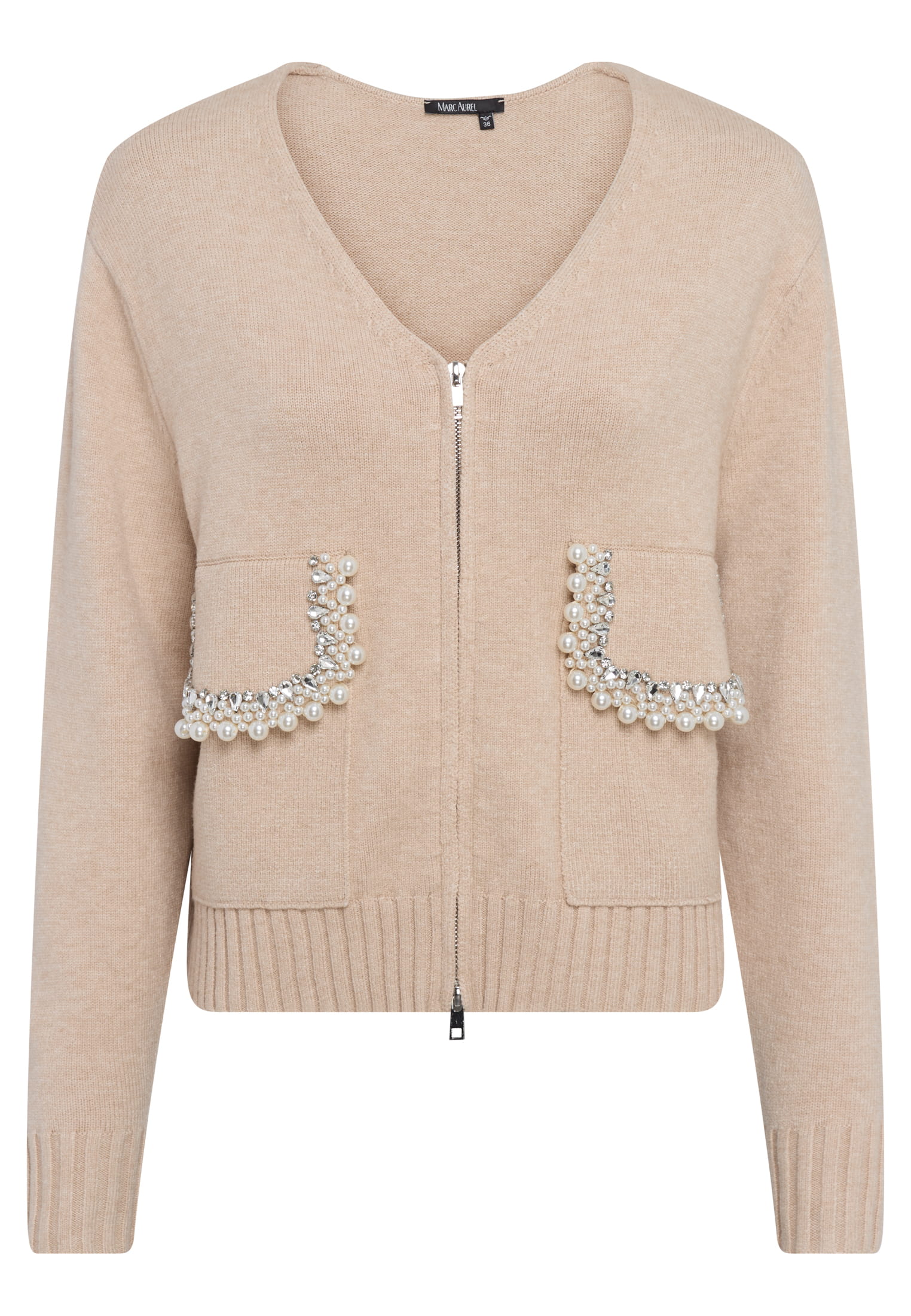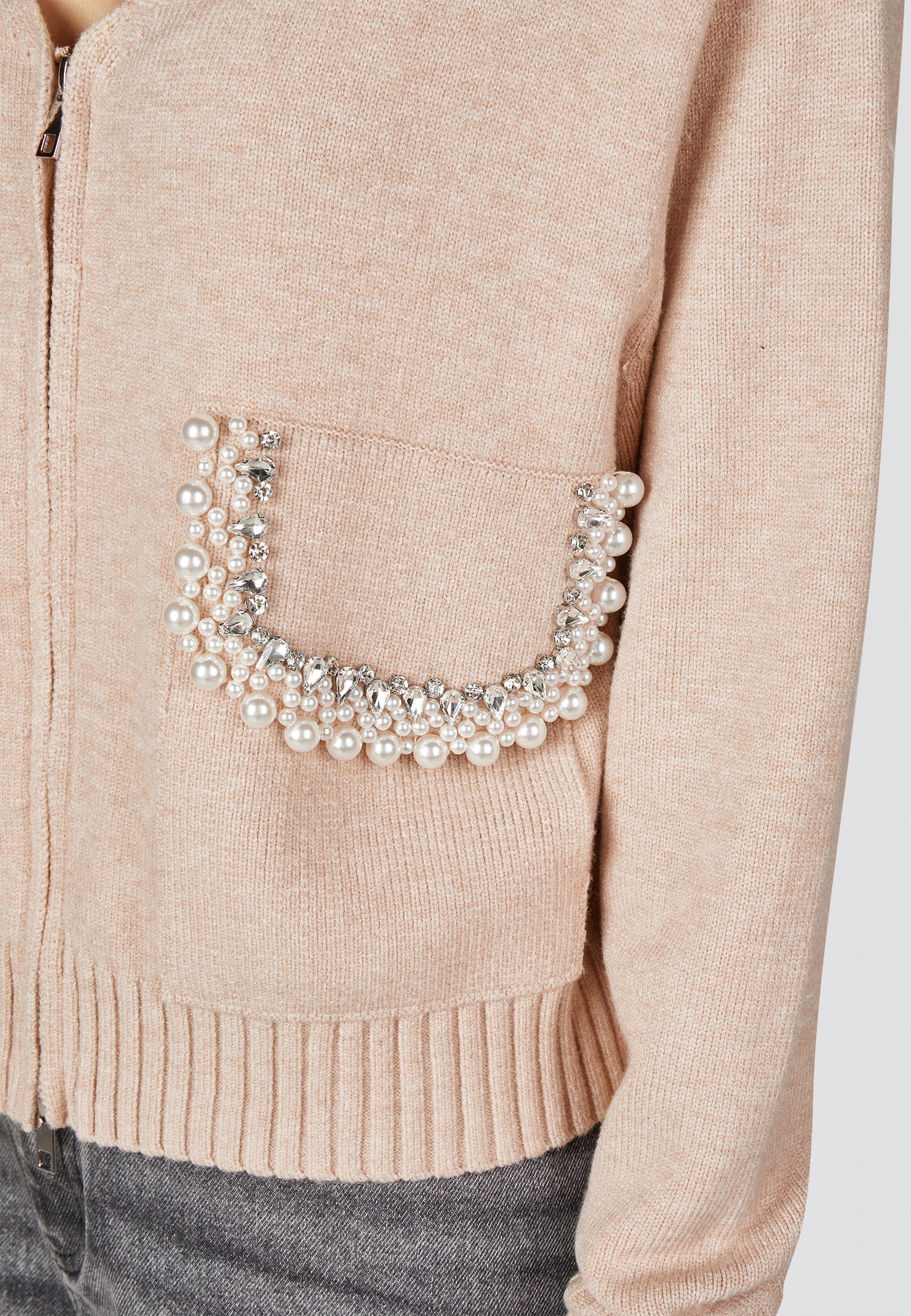 Diese Strickjacke aus weichem Viskose-Mix vereint zeitlose Eleganz. Die aufgesetzten Taschen sorgen für eine praktische Note, während Perlen-Applikationen dem Design eine edle Ausstrahlung verleihen. Dank Rippenabschlüssen und einer lockeren Passform lässt sie sich vielseitig kombinieren.